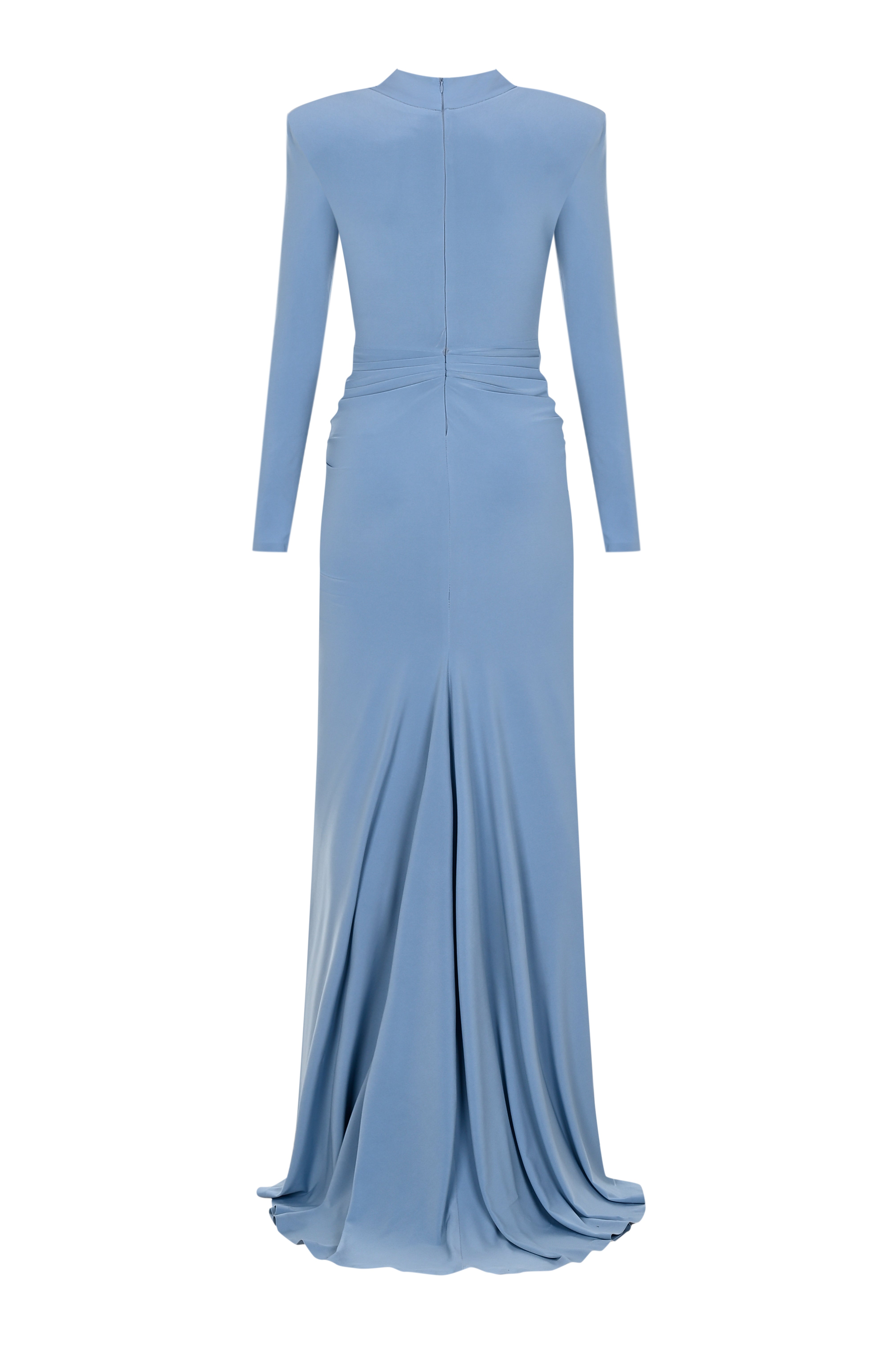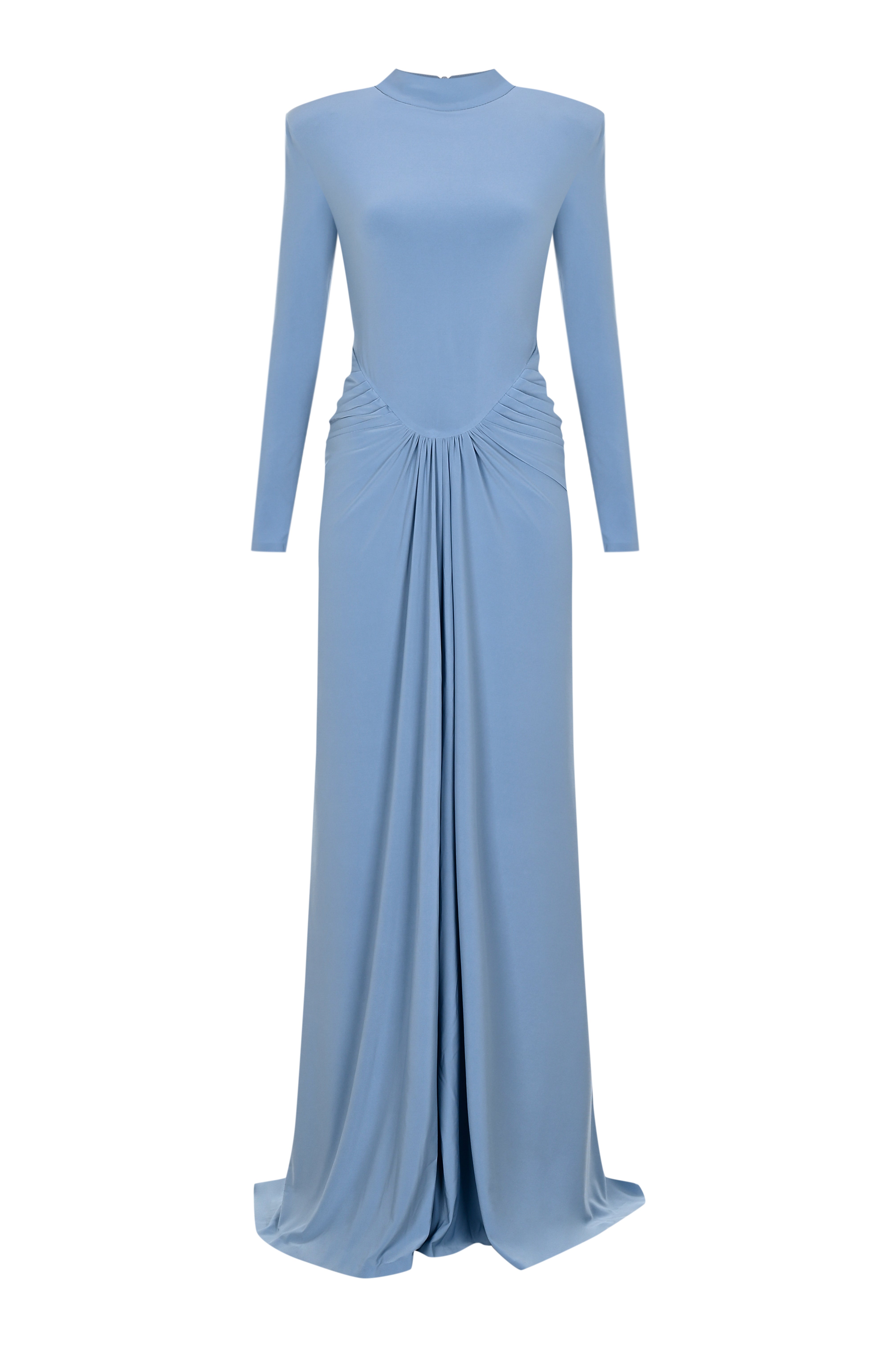 Glambils' elegant Azure Grace Dress embodies sophistication at its finest. With its high neckline and long sleeves, it offers a timeless silhouette, while the ruched details at the waist and draped fabric beautifully accentuate the body’s curves.
