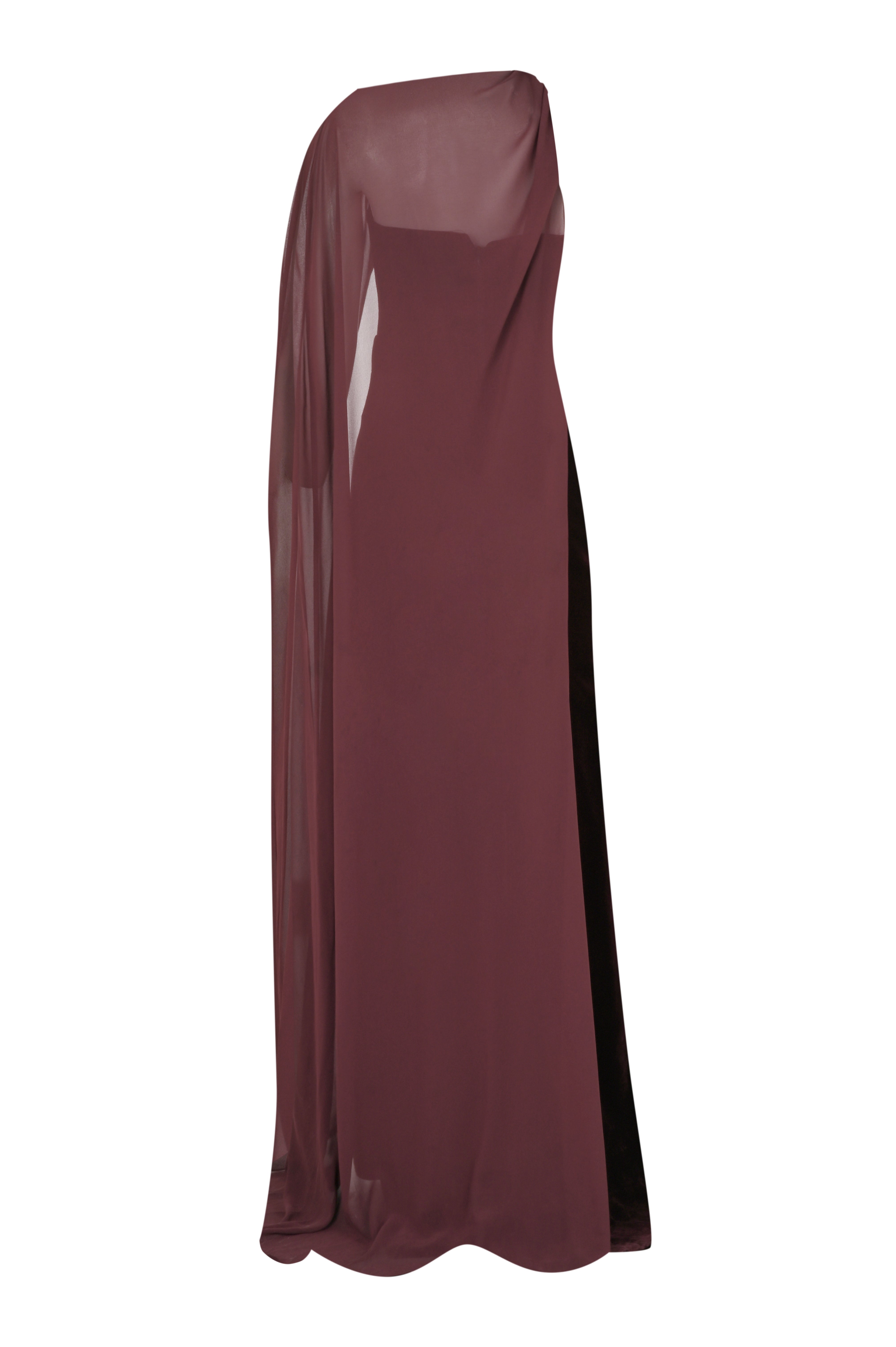 Burgundy Aura Dress showcases elegance in its most dramatic form with its velvet texture and cascading one-shoulder chiffon cape. The strapless corset bodice sculpts the figure beautifully, while the flowing cape design adds a powerful and unforgettable silhouette.
