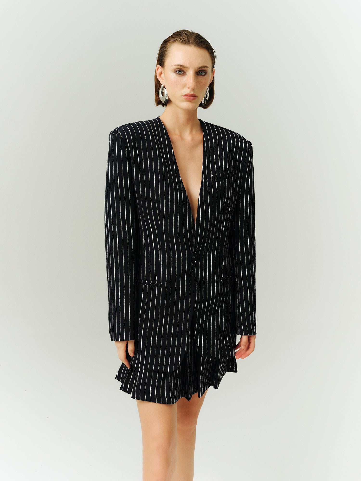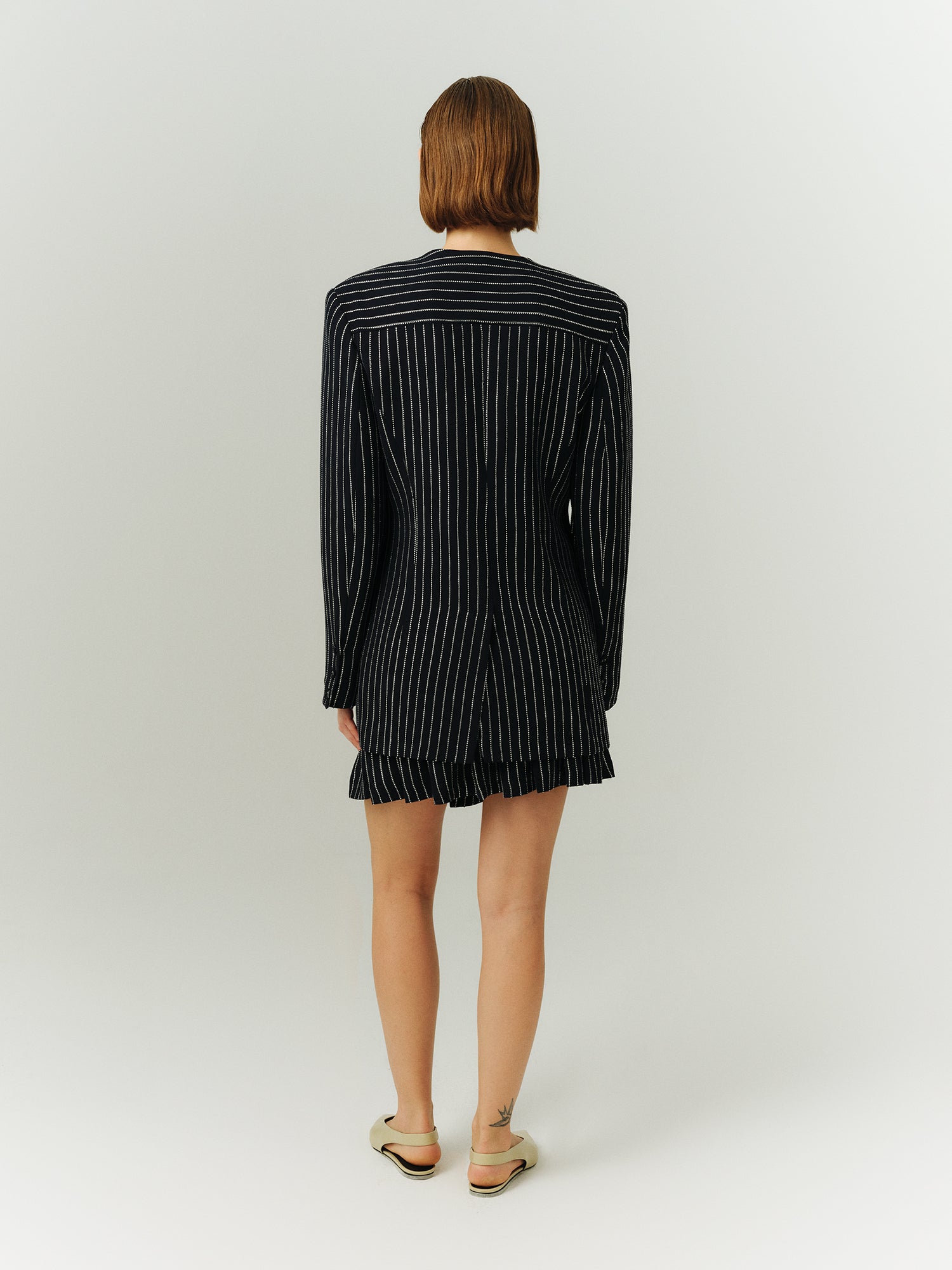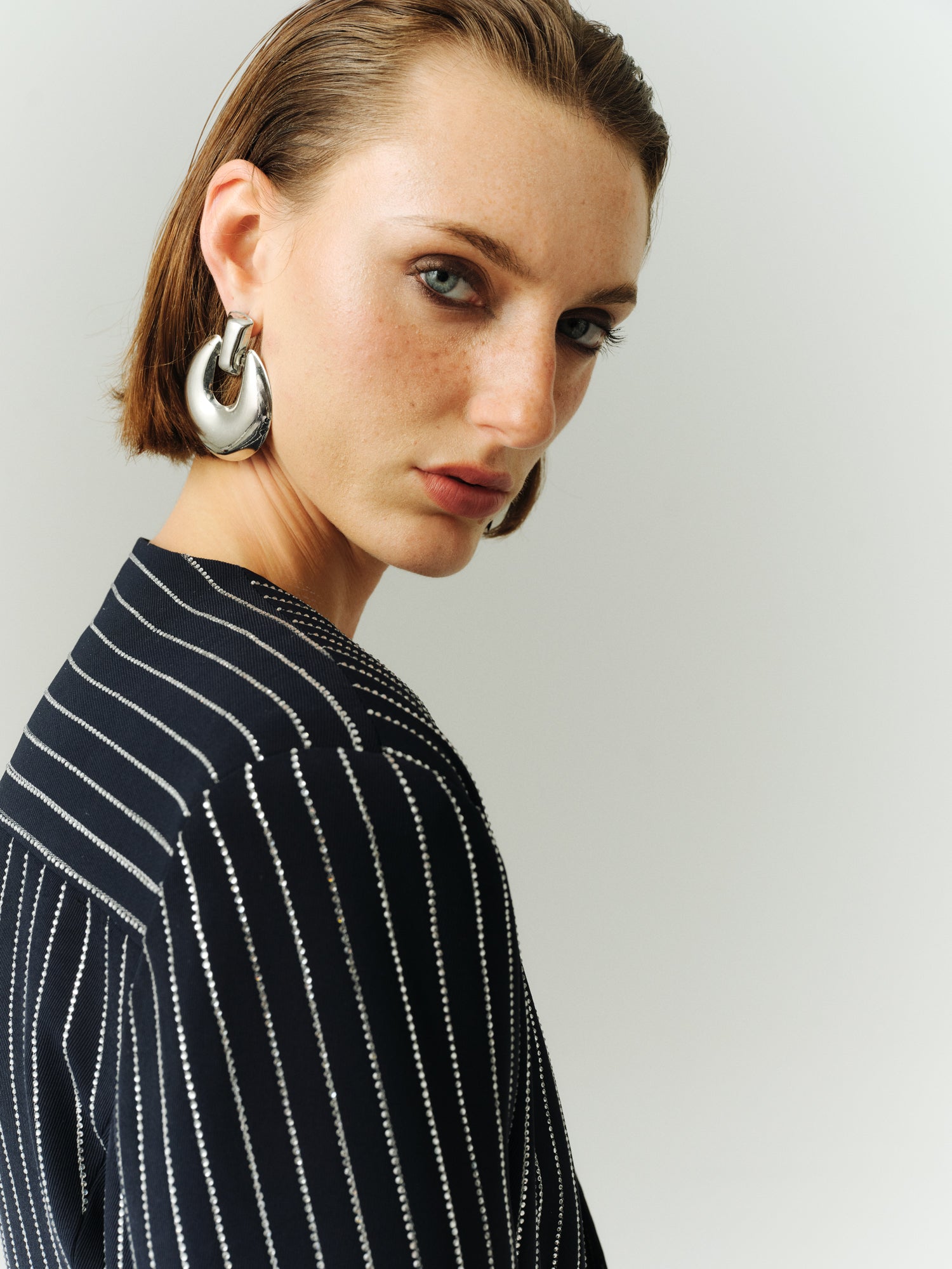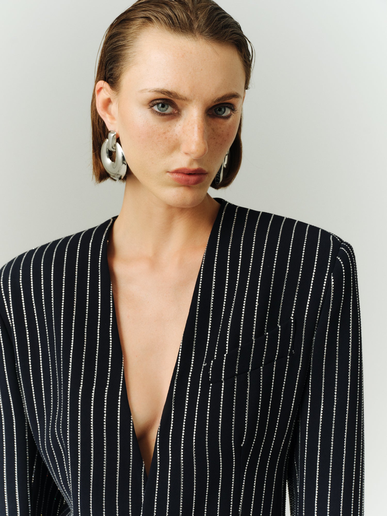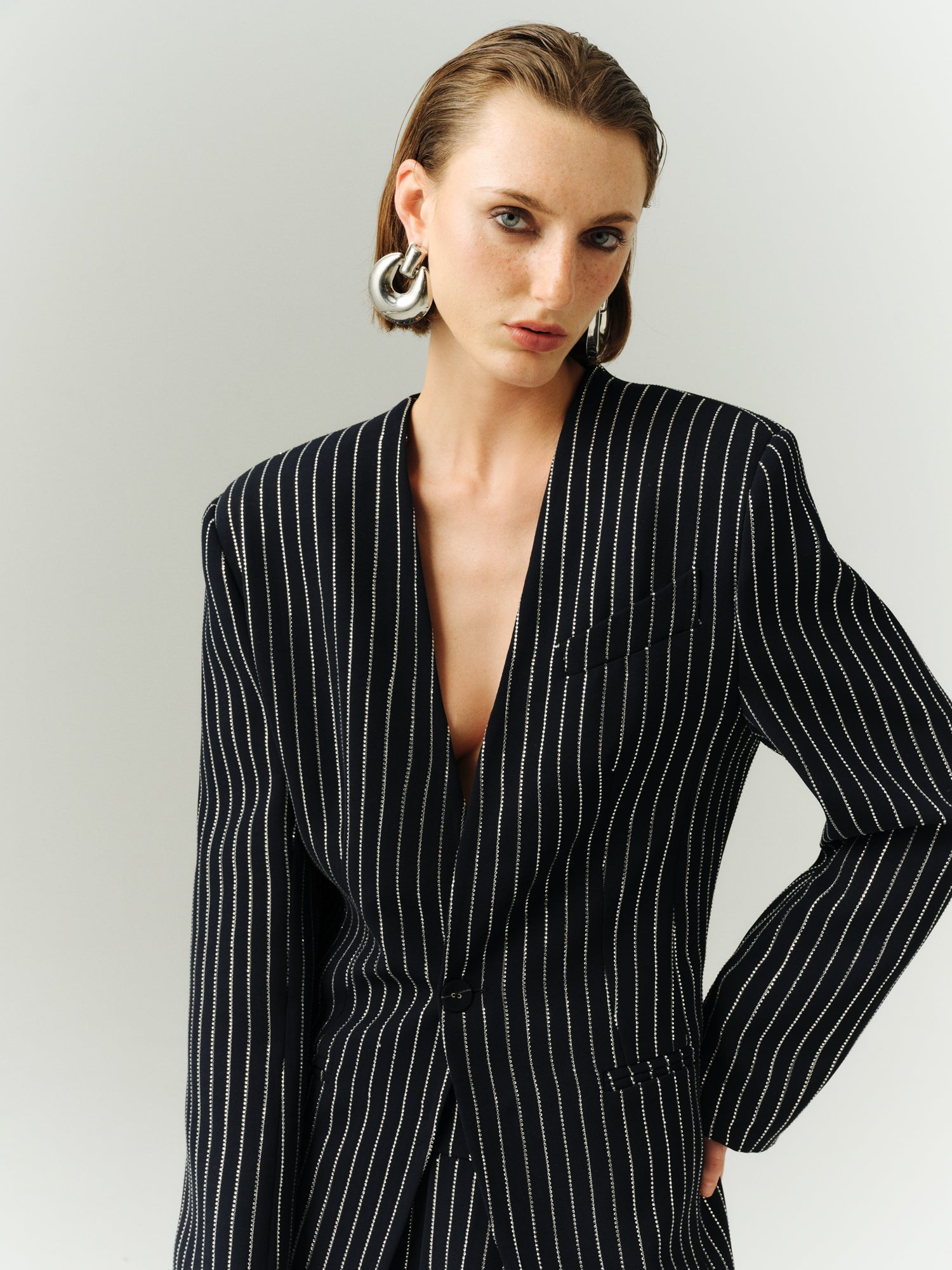 Luxurious Swarovski crystal-studded fabric meets silk satin lining in this striking, padded-shoulder set.