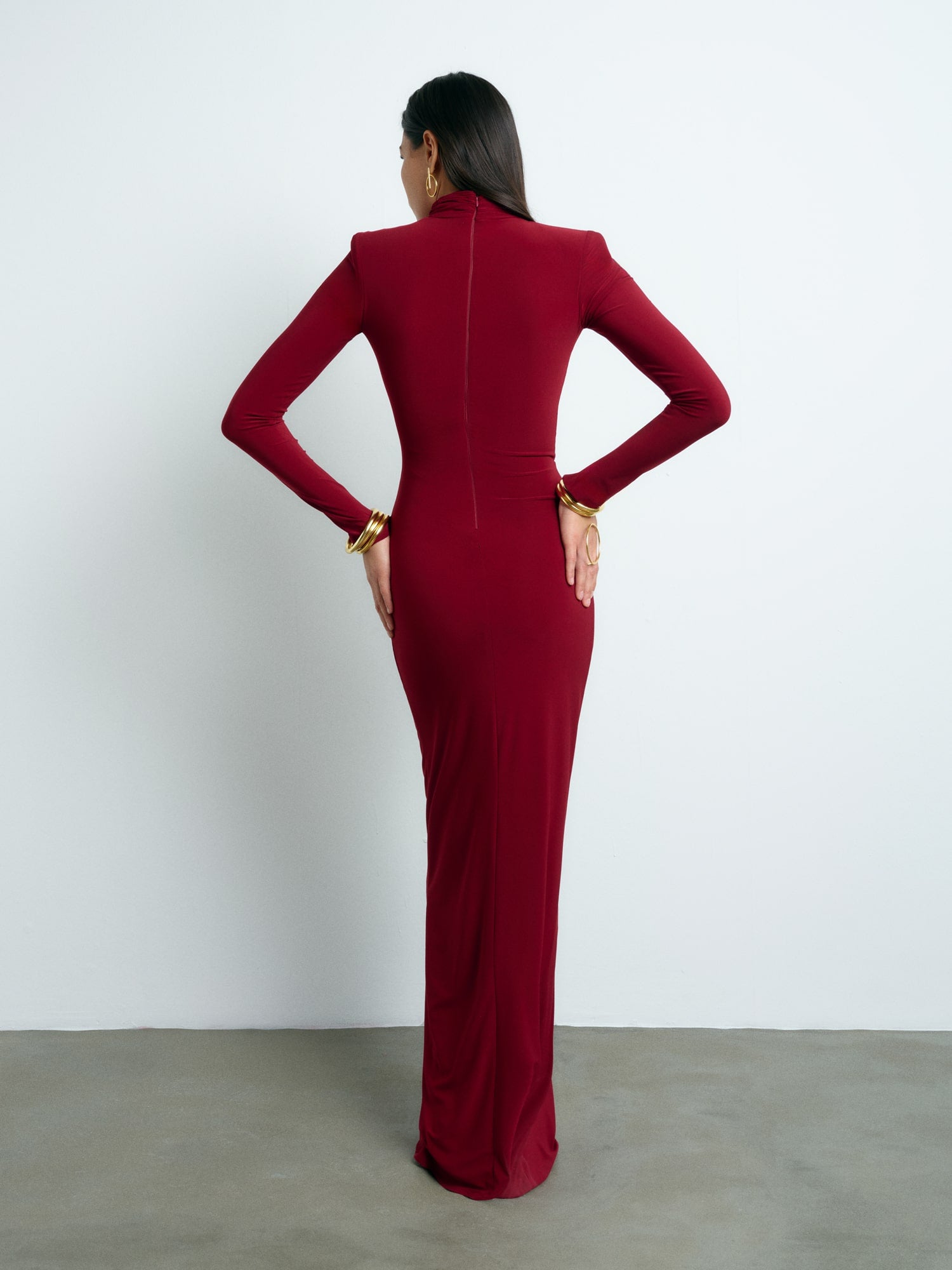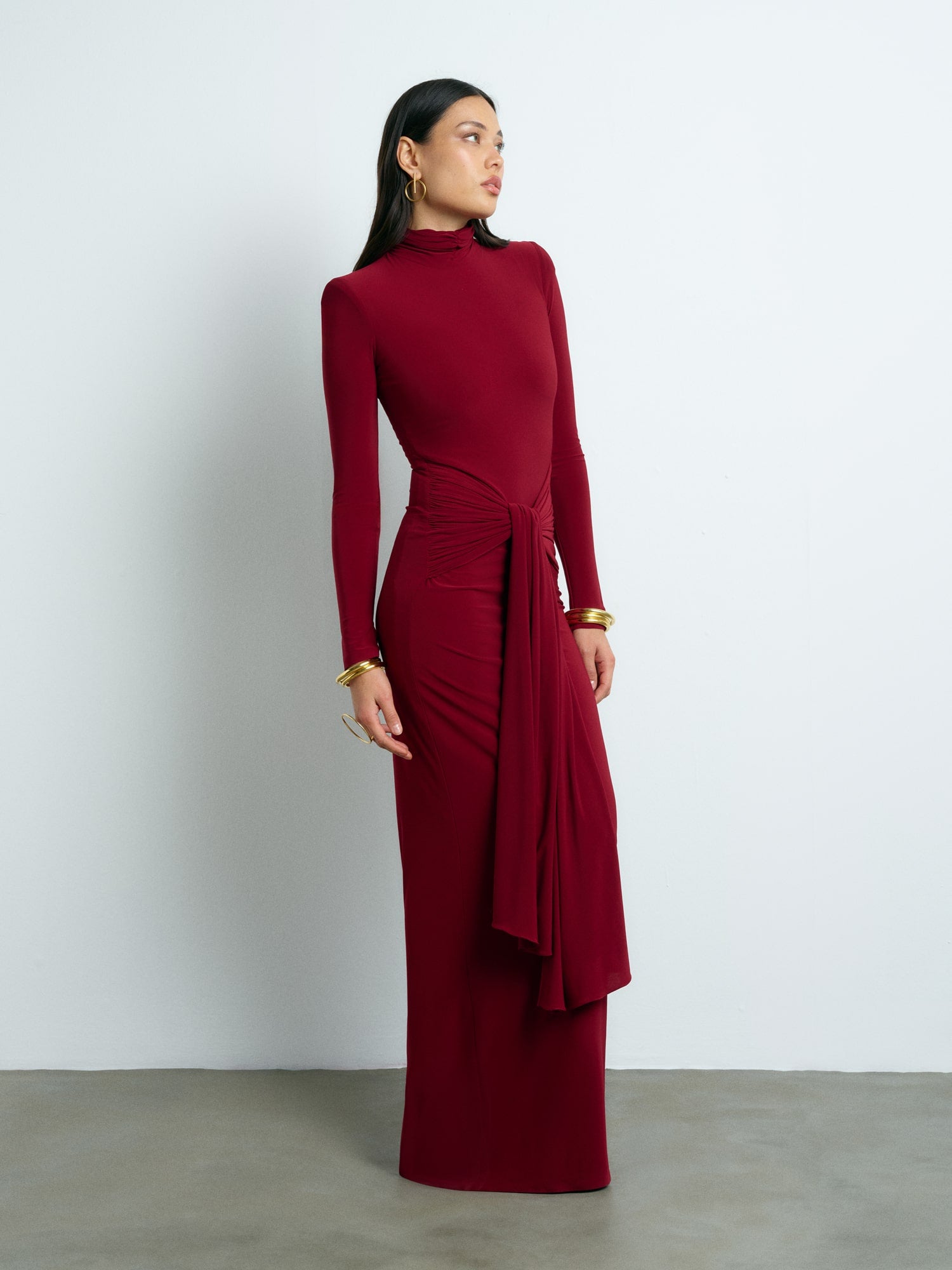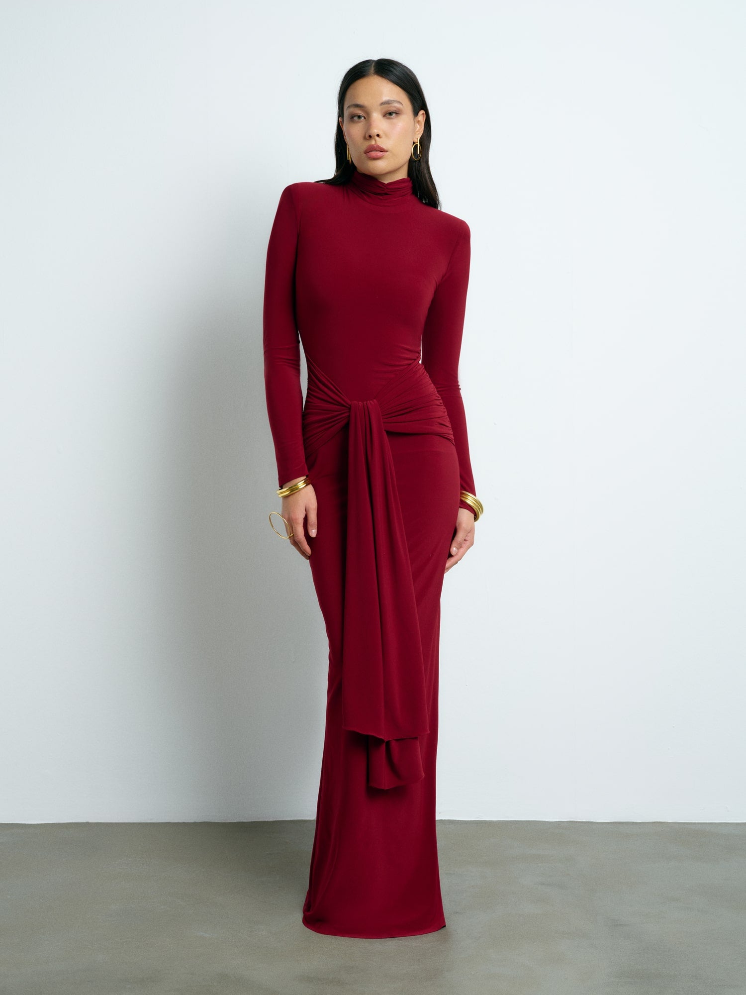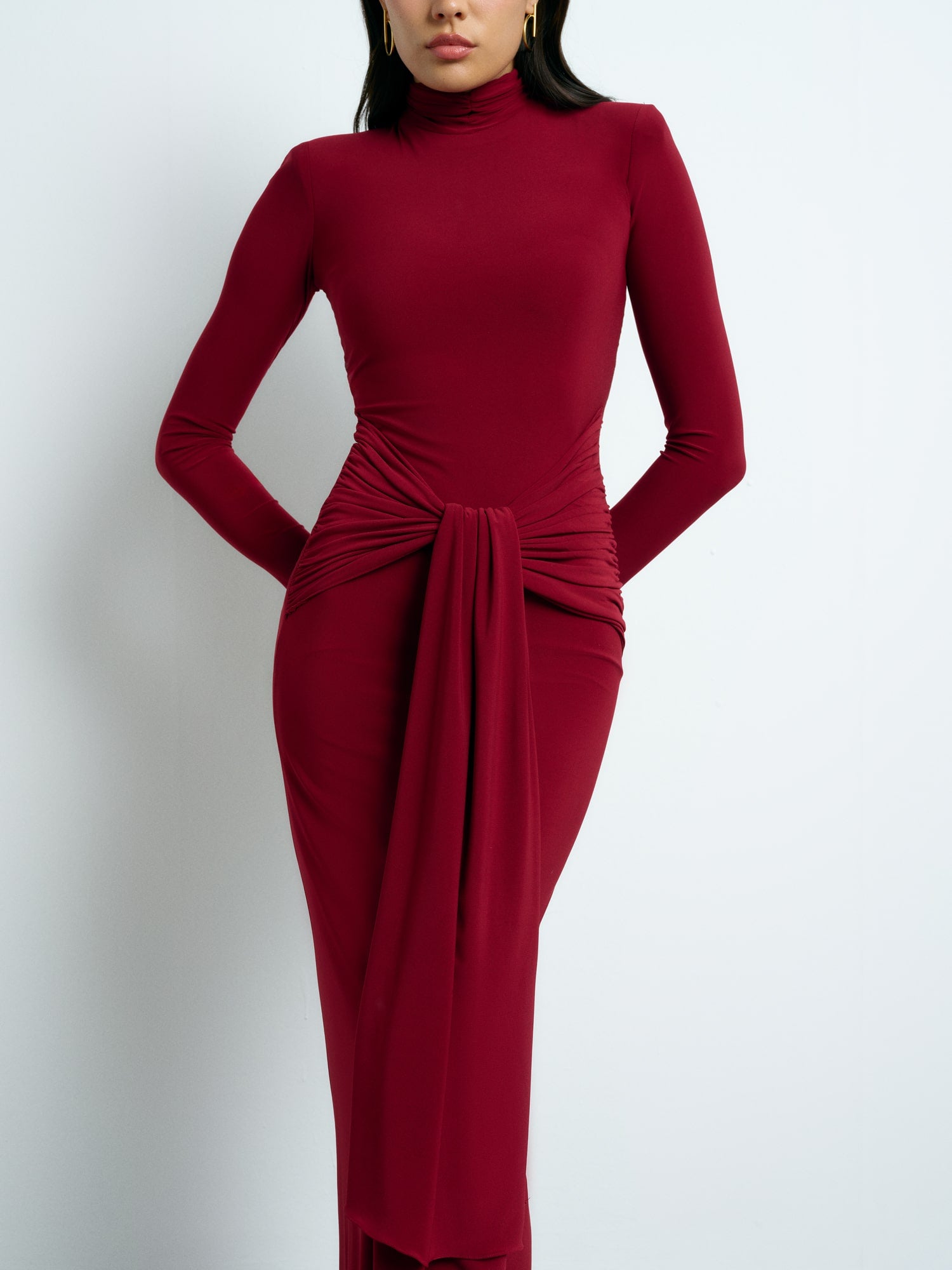 Glambils Emily Dress embodies the pinnacle of sophistication and grace. With its high neckline and long sleeves, it offers a timeless silhouette, while the ruched details and draped fabric at the waist perfectly accentuate the body's contours.