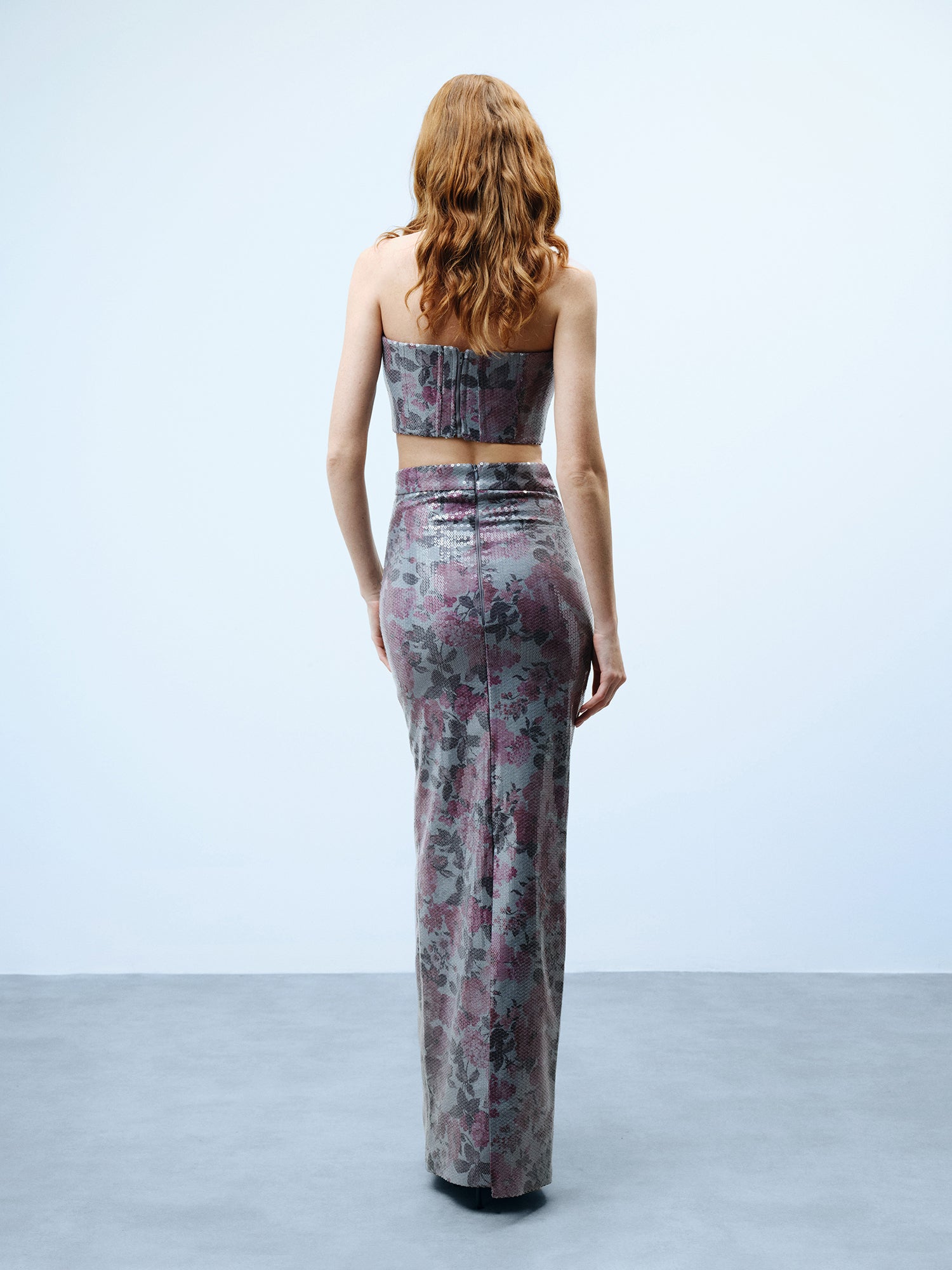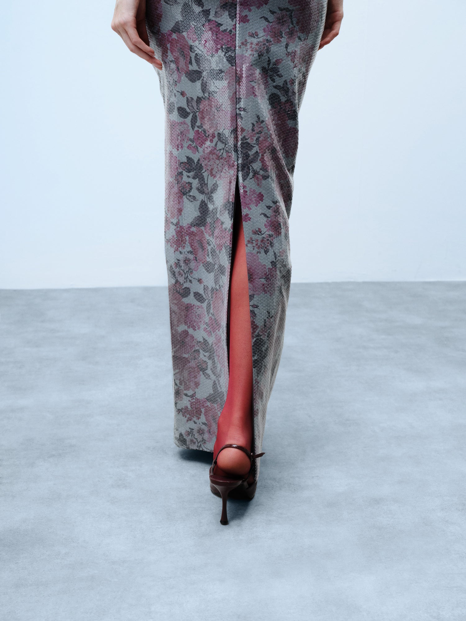 Step into a world of subtle elegance with Fleurs du Jardin Gris, a dress inspired by the enchanting allure of a moonlit garden. This piece combines delicate floral motifs with a soft grey palette, creating a blend of sophistication and whimsy.