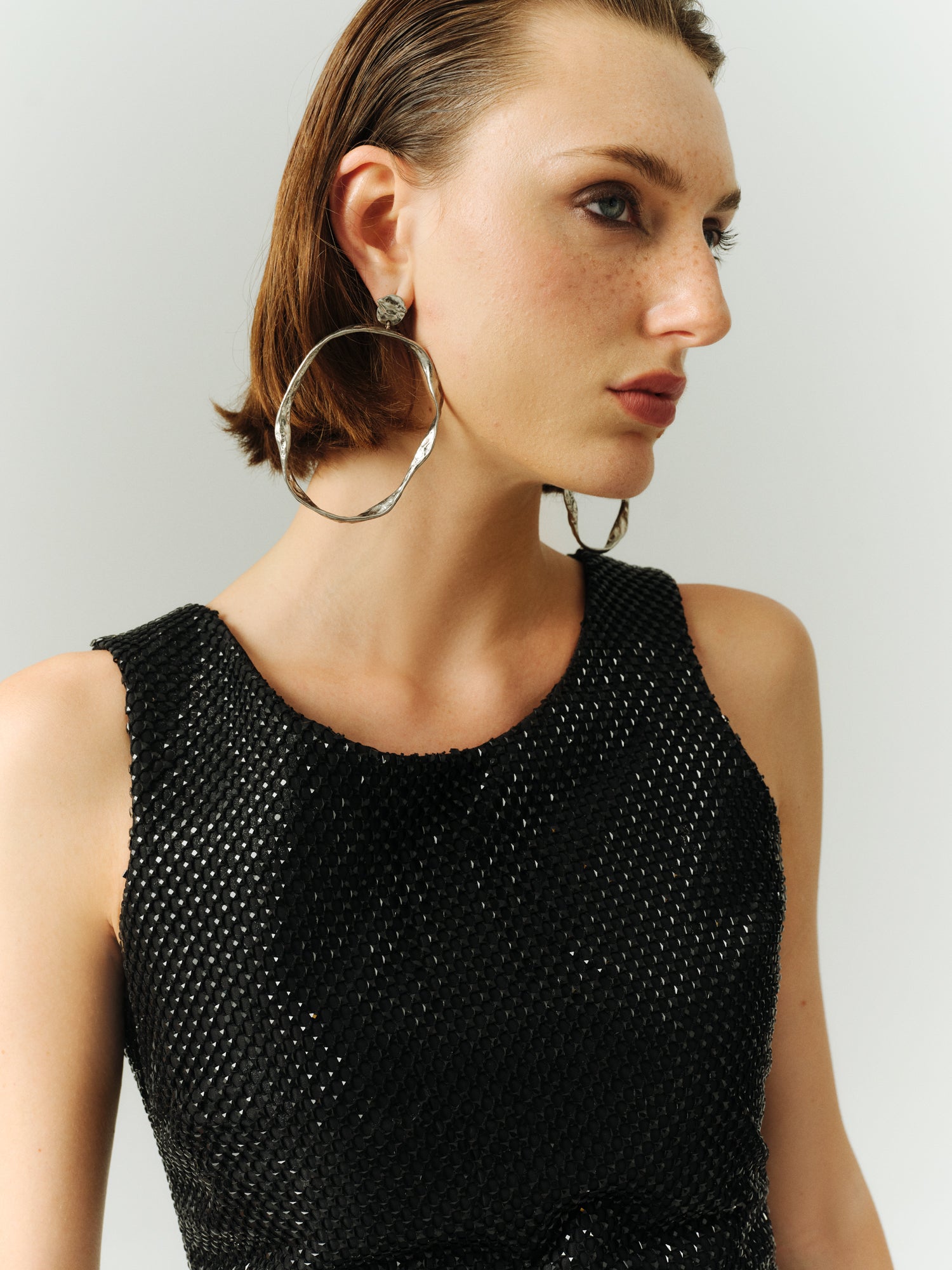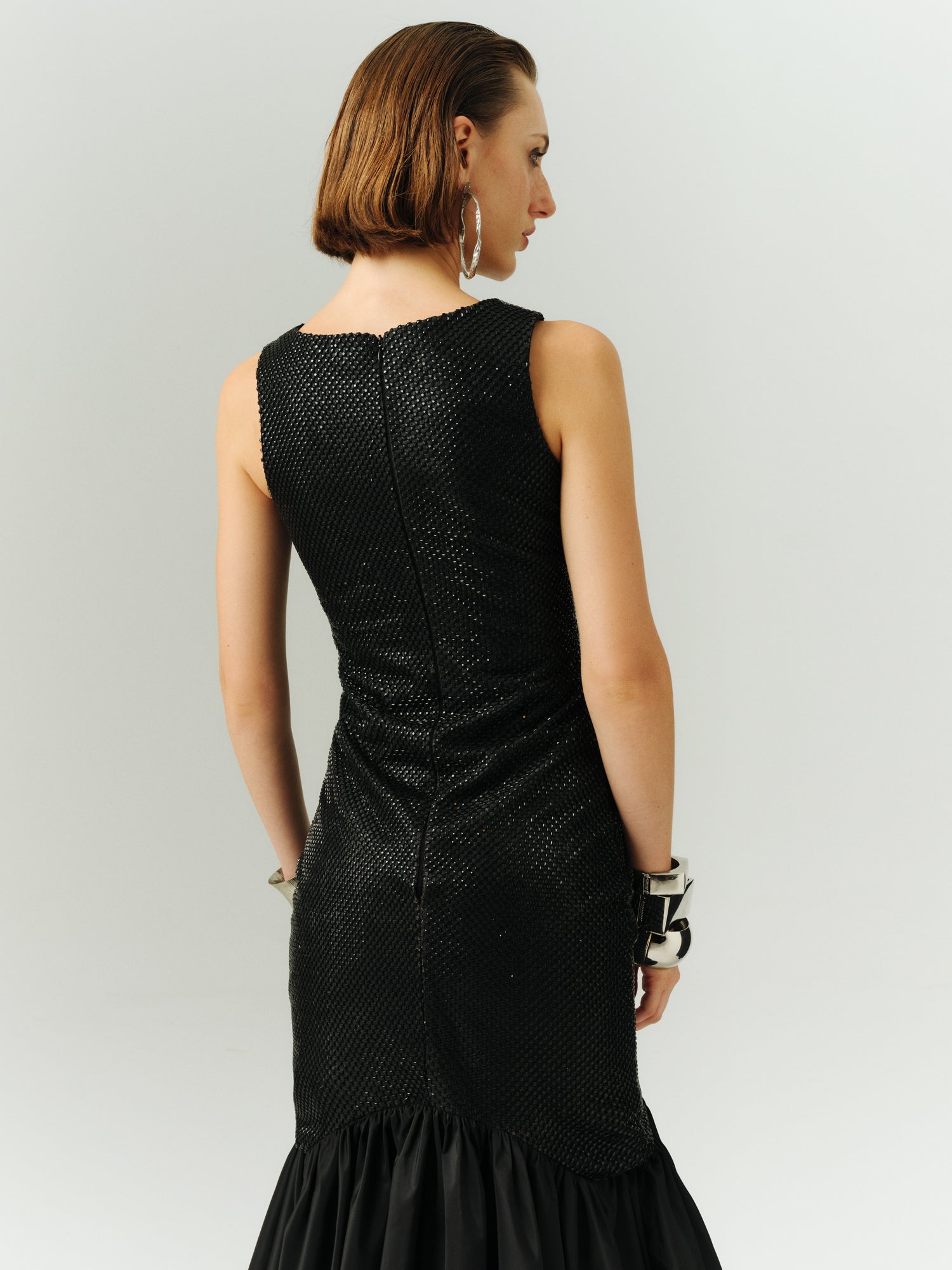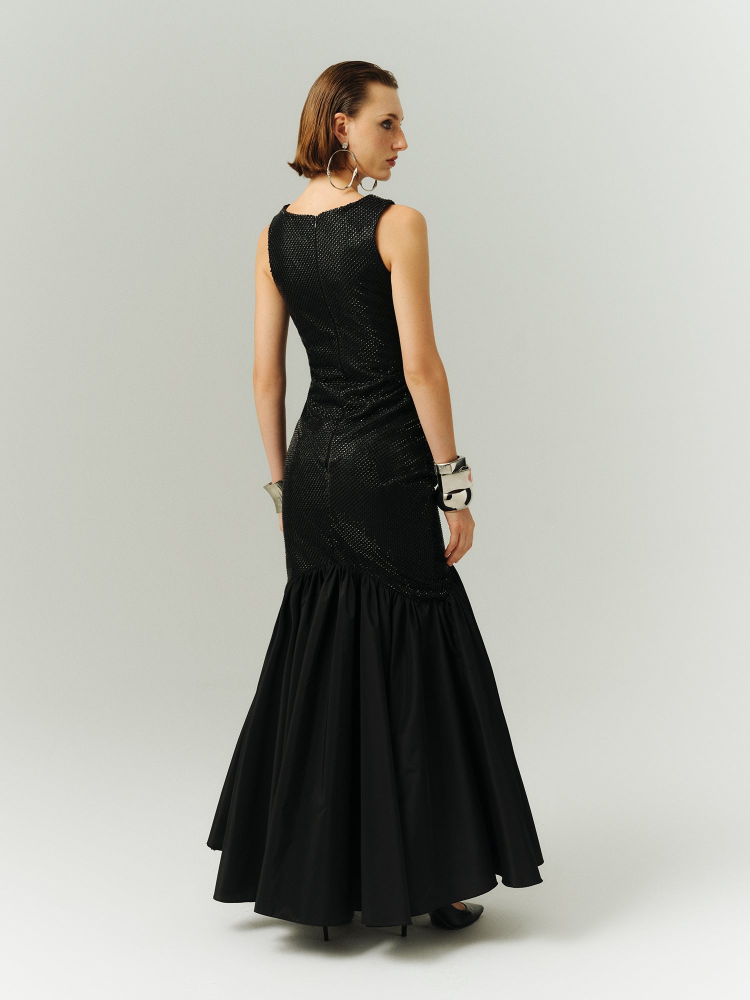 A form-fitting taffeta dress that exudes elegance, perfect for making an unforgettable impression.