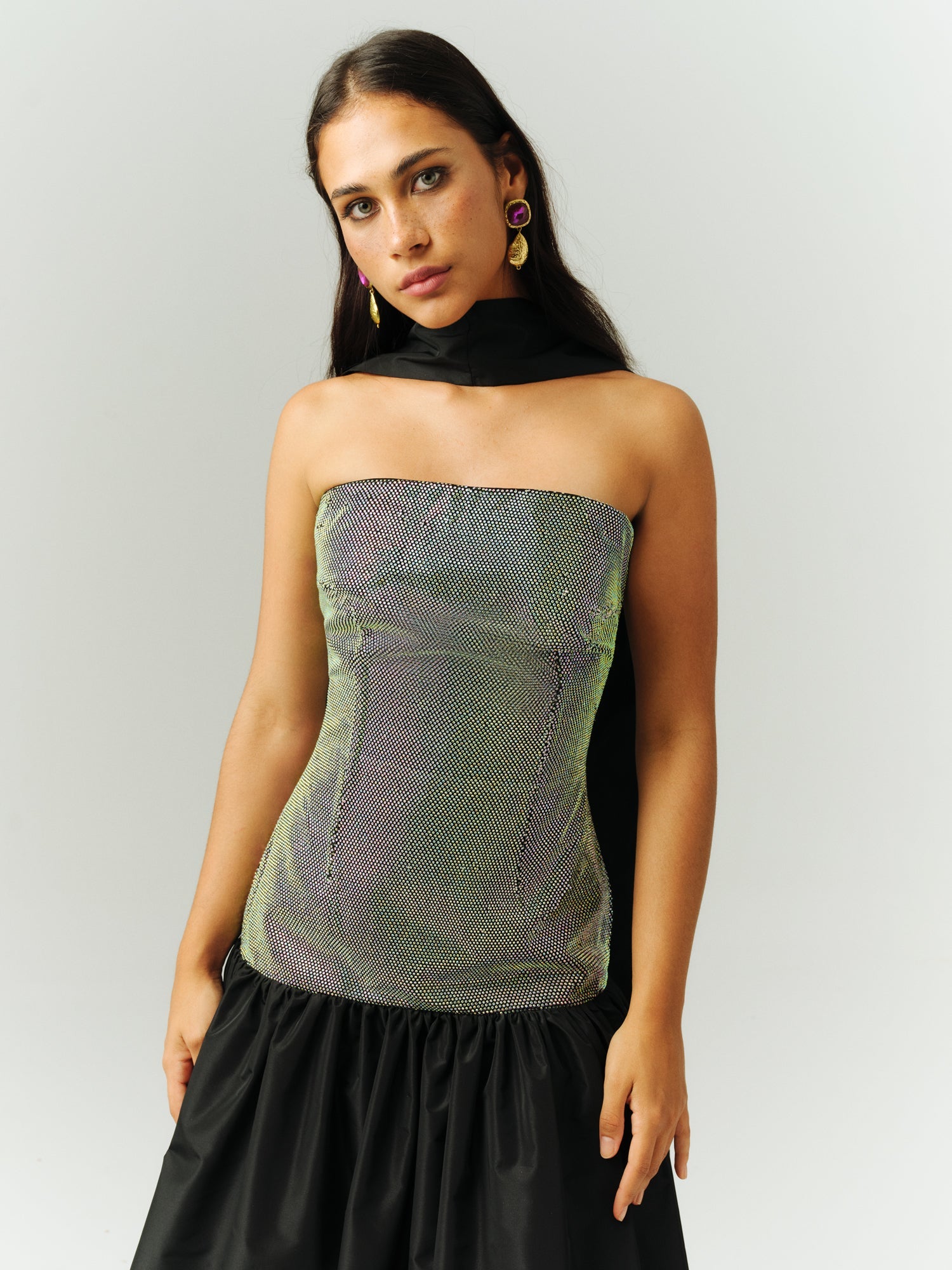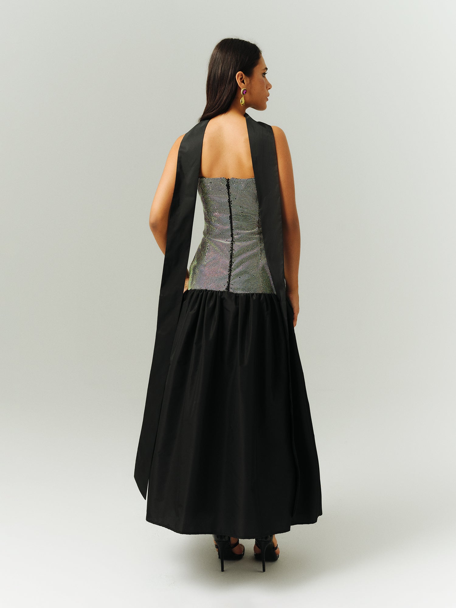 A strapless taffeta dress with an embellished bodice, designed to create a stunning silhouette.