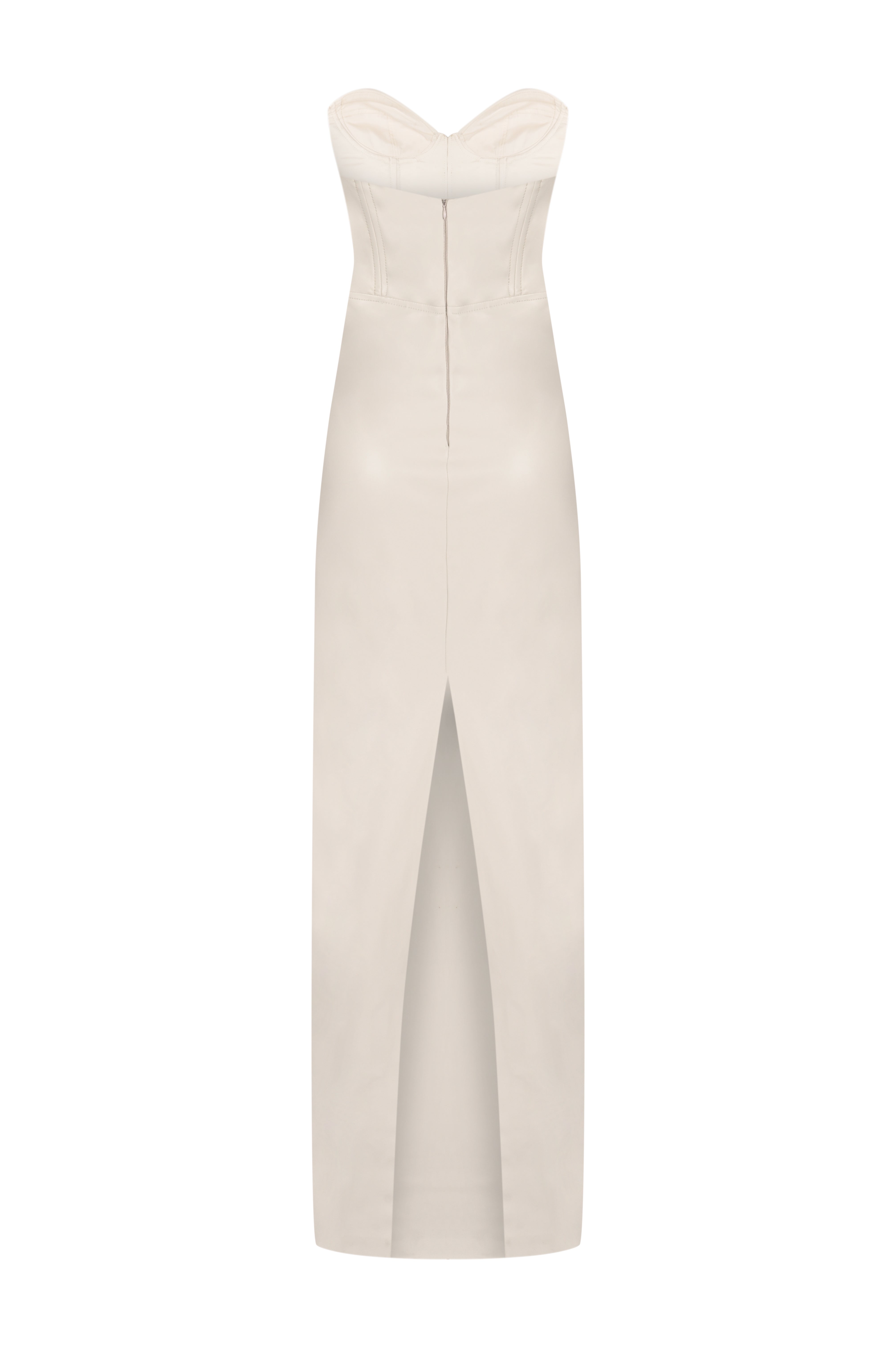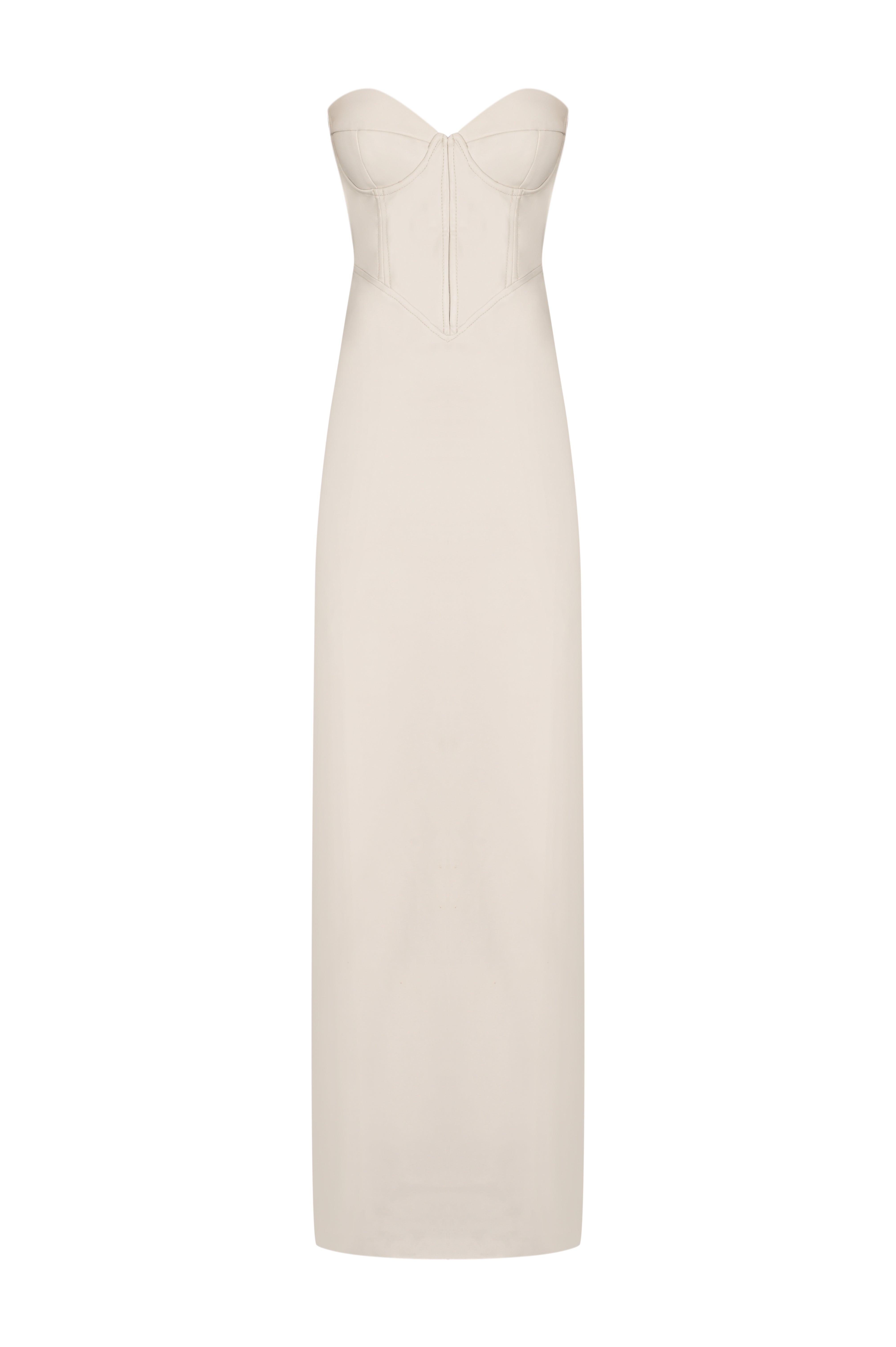 Ivory Sculpt offers a modern and sophisticated look with its corset-style bodice and elegant long silhouette. The strapless sweetheart neckline and front slit create a feminine yet powerful presence.