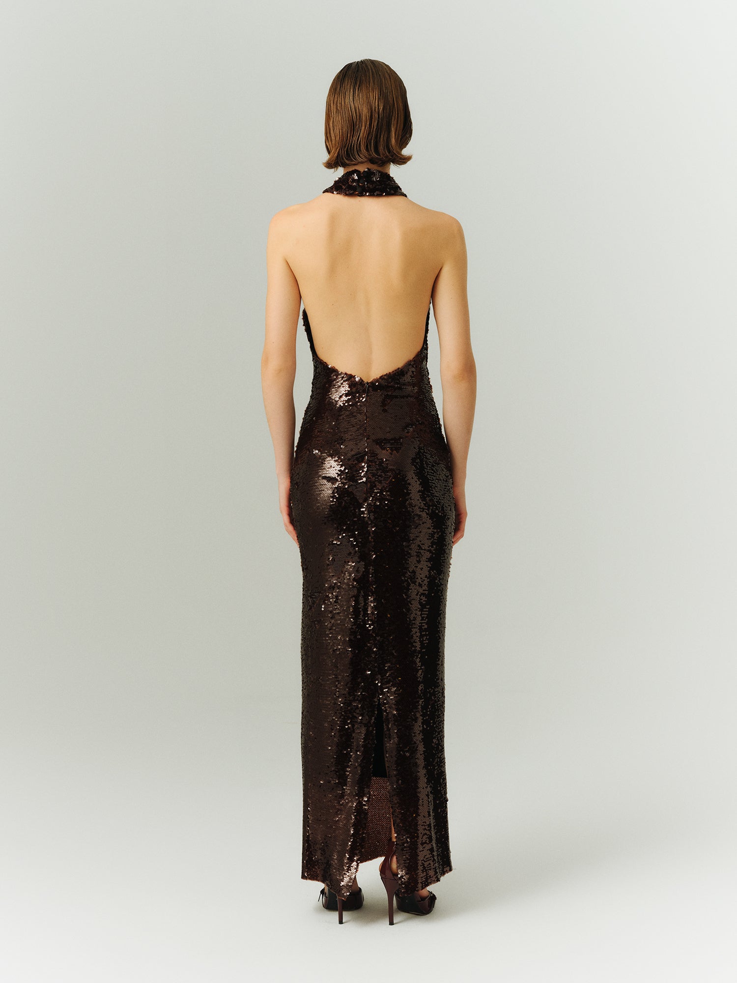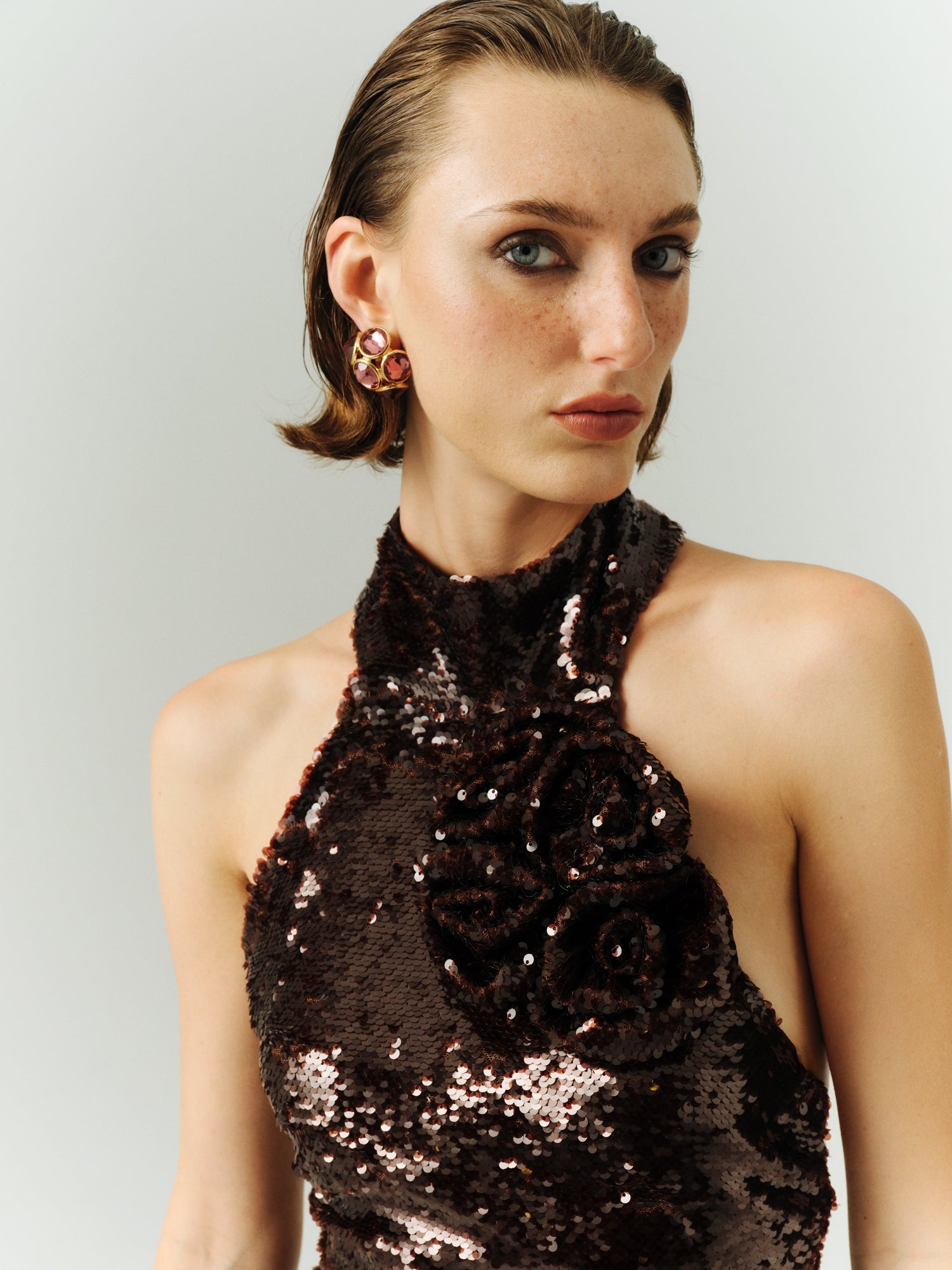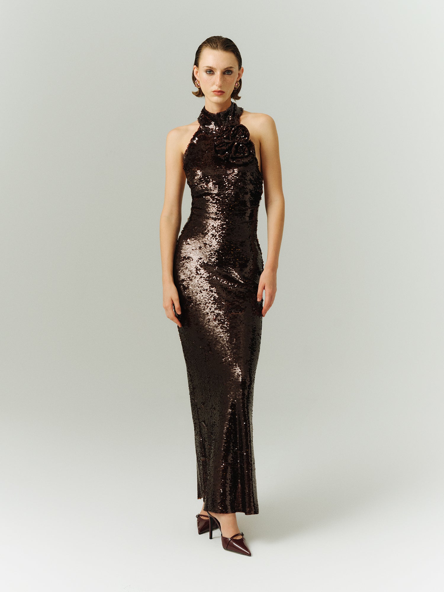 This form-fitting dress features a detailed neckline and a detachable rose accessory, offering elegance with a versatile twist.