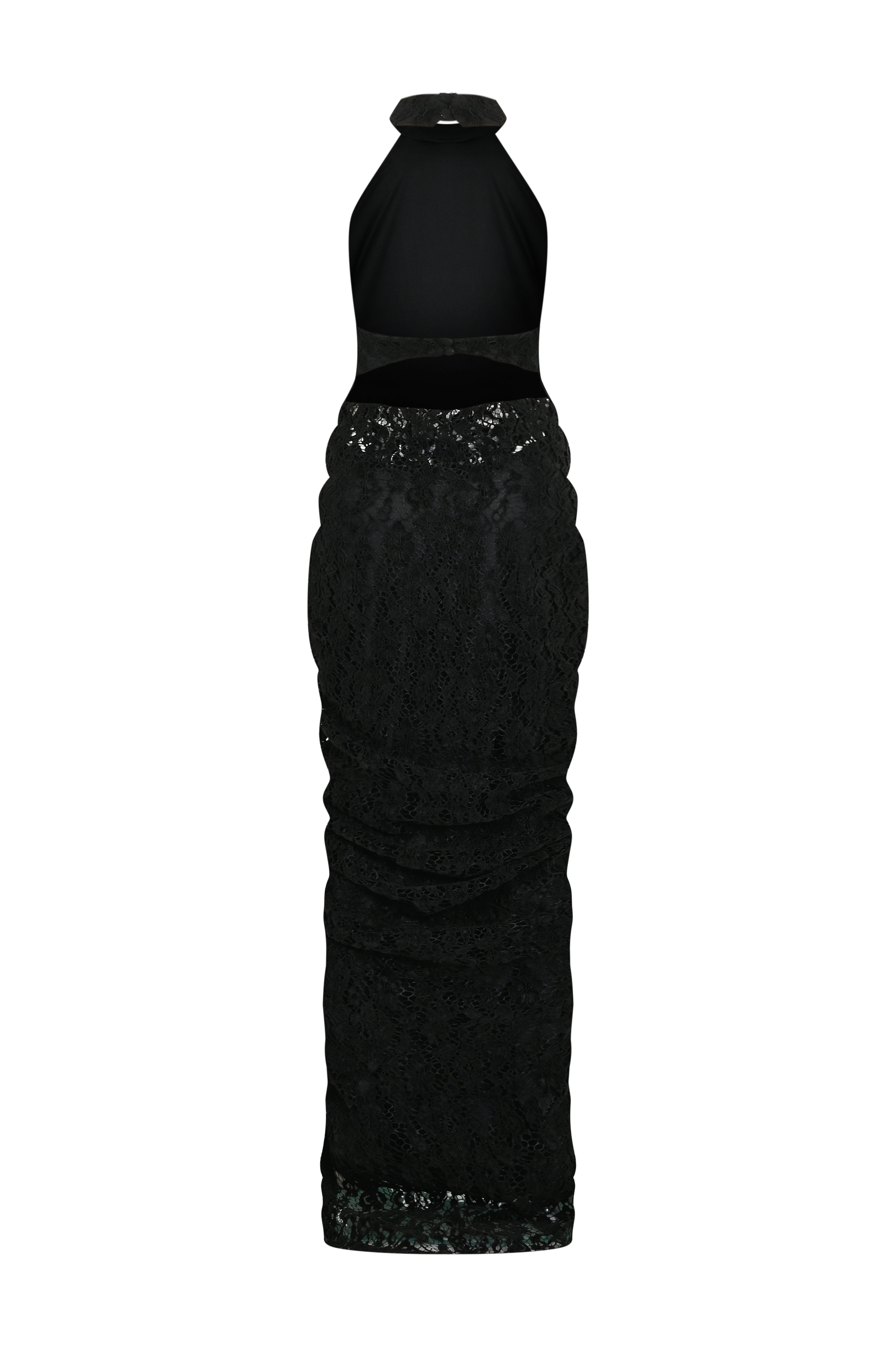 Lunar Eclipse Dress offers a powerful and sophisticated look with its black lace texture and draped silhouette. The halter neckline, sleeveless design, and deep back detail create a modern elegance, while its maxi length highlights refined sophistication for special occasions.