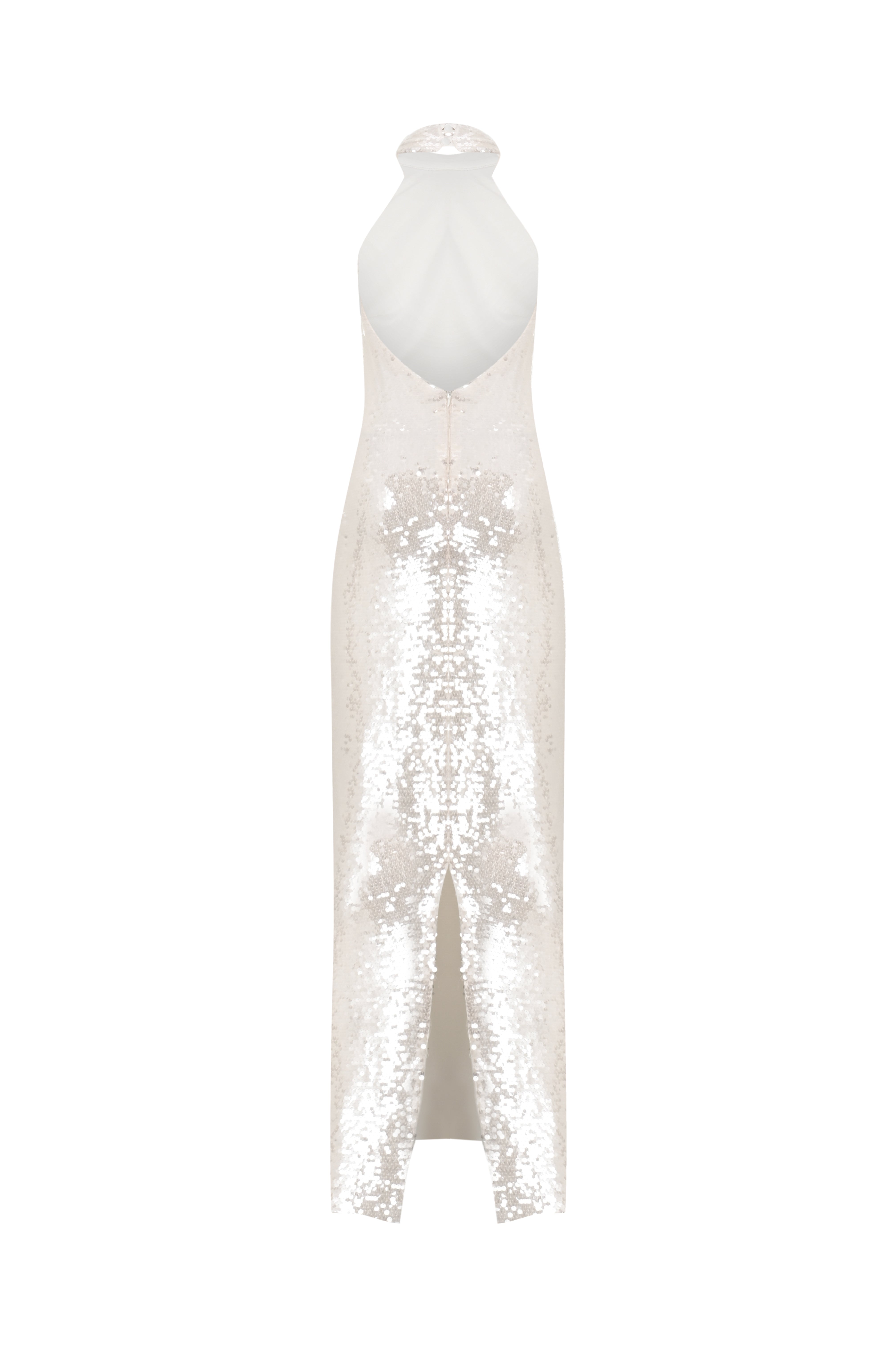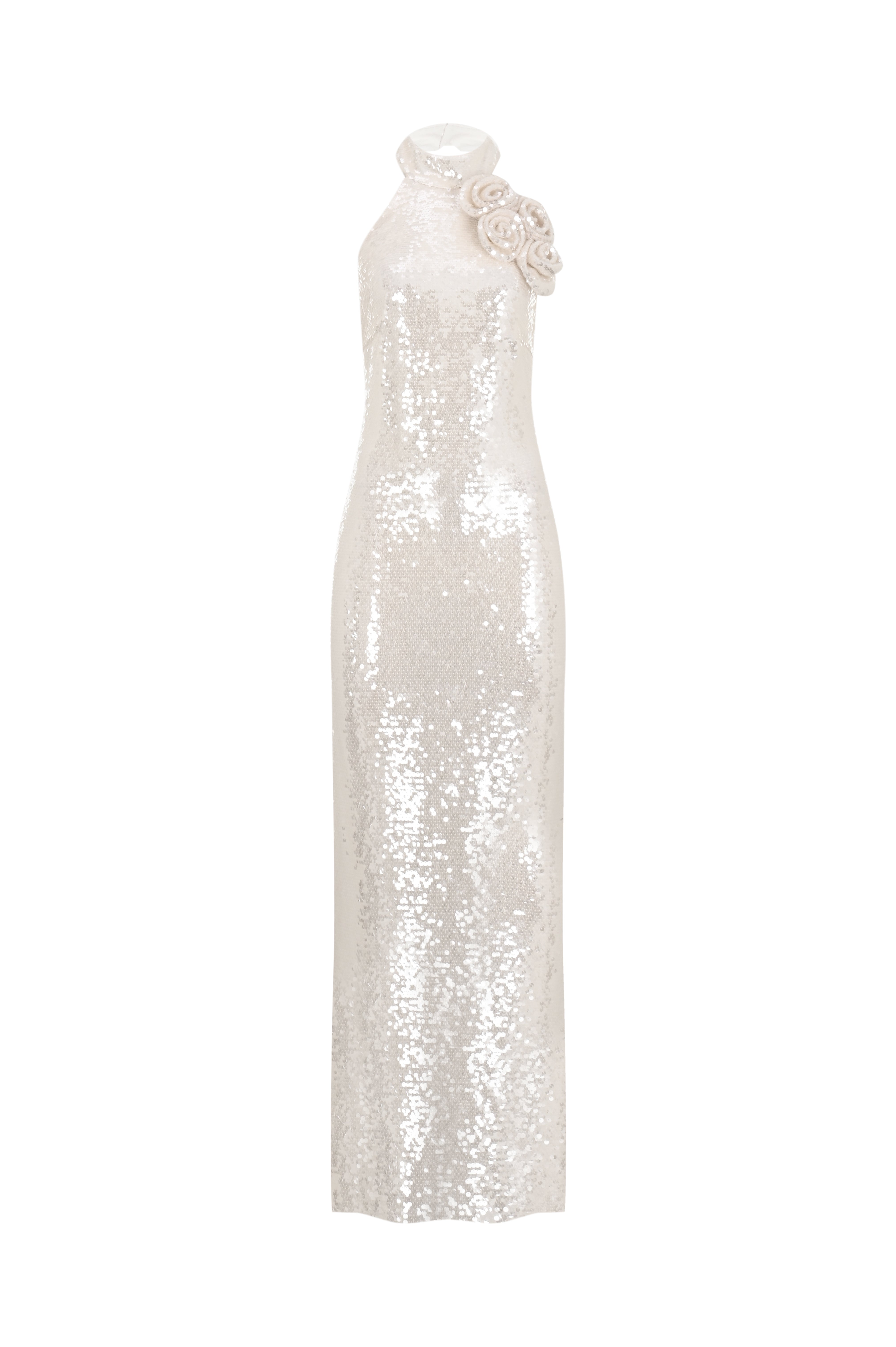 The halter neckline meets a graceful rose accessory at the neck, creating a captivating look. With its open back and sequin fabric, Nellie Dress brings elegance to every step you take.