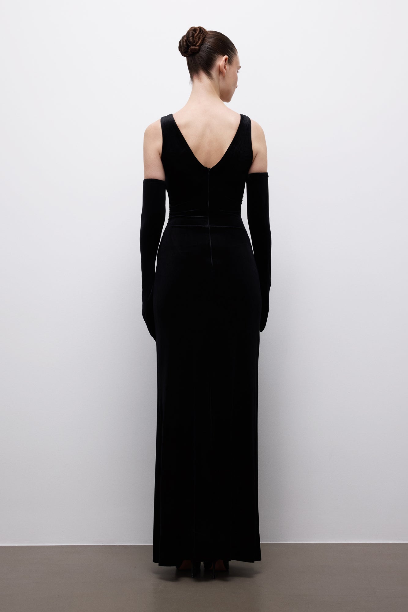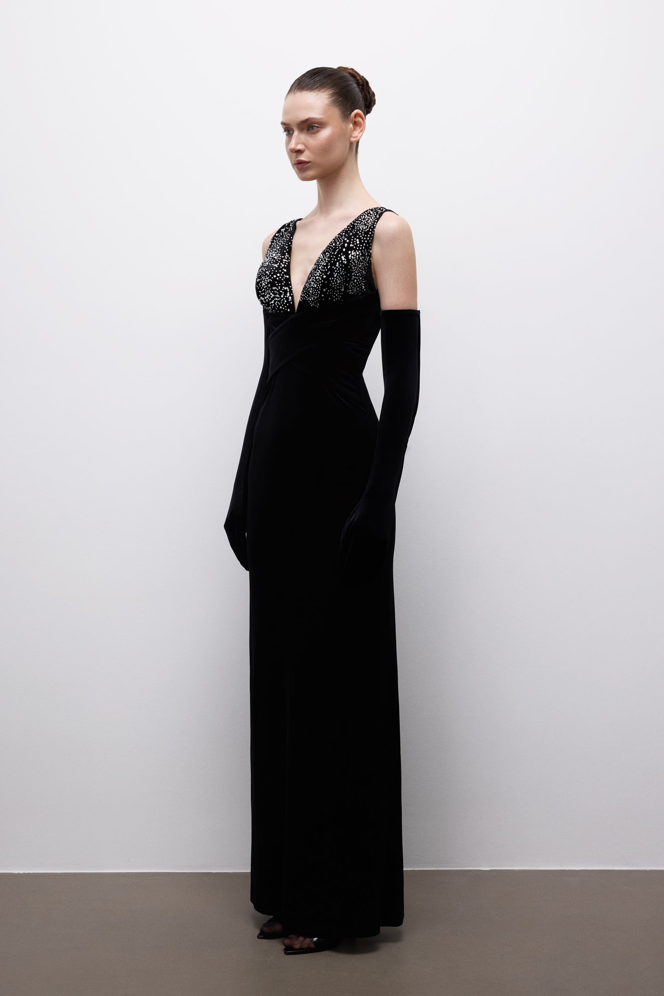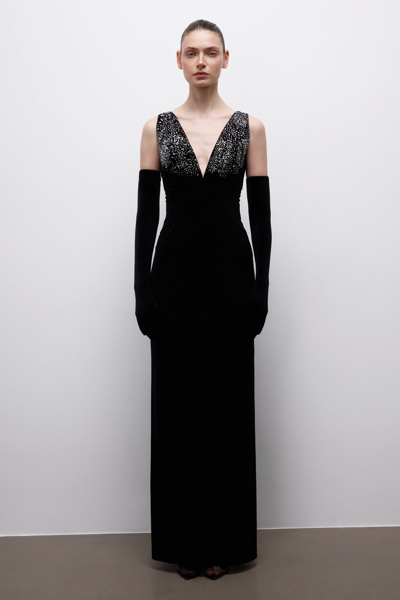 A deep V-neckline and delicate stone embellishments create a balanced, powerful stance.