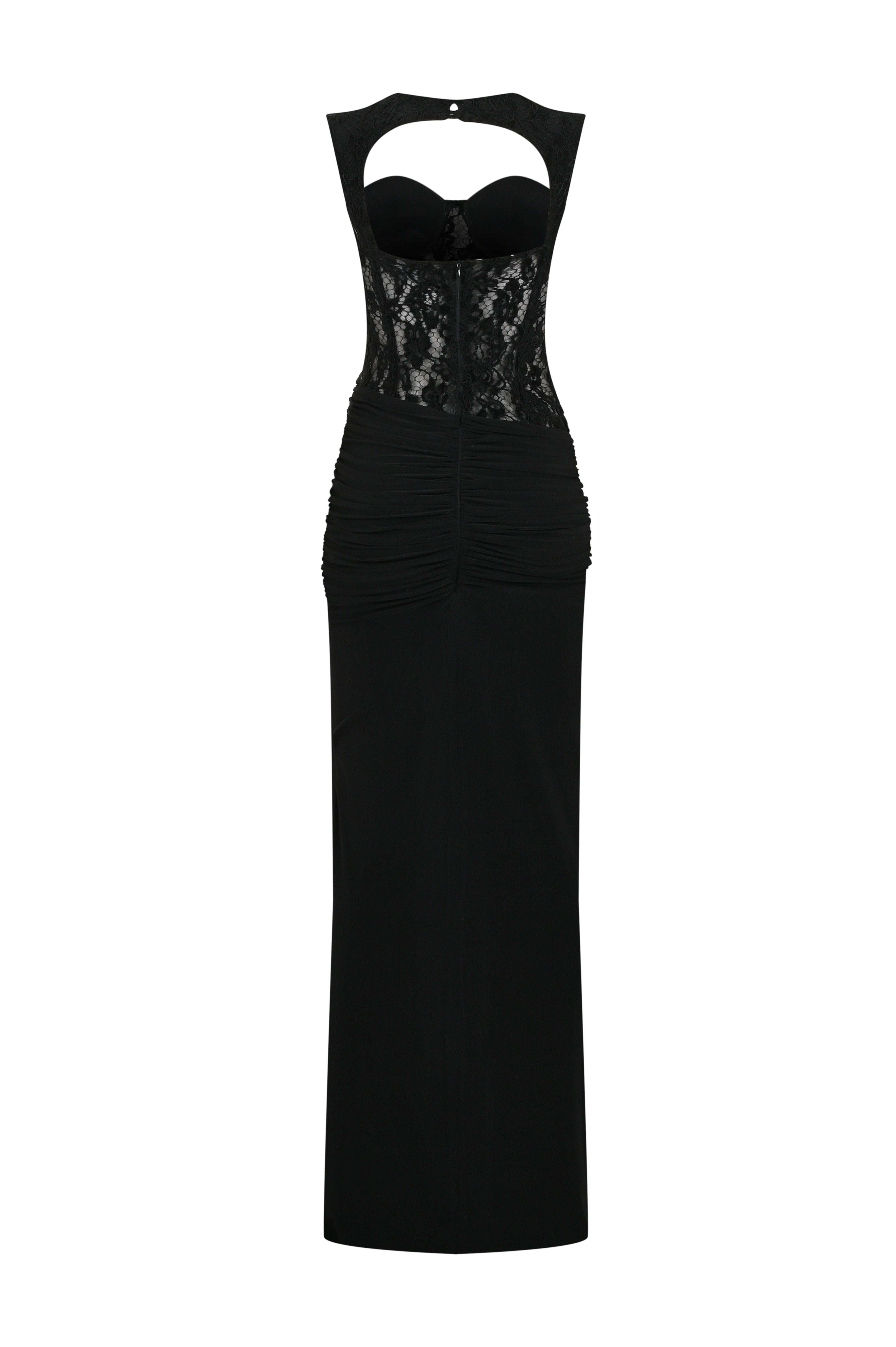Obsidian Noir Dress creates a strong and feminine silhouette with its lace bust design and draped skirt. The supportive bust structure and open-shoulder detail deliver a modern, confident look, while its maxi length adds striking elegance to any special occasion.