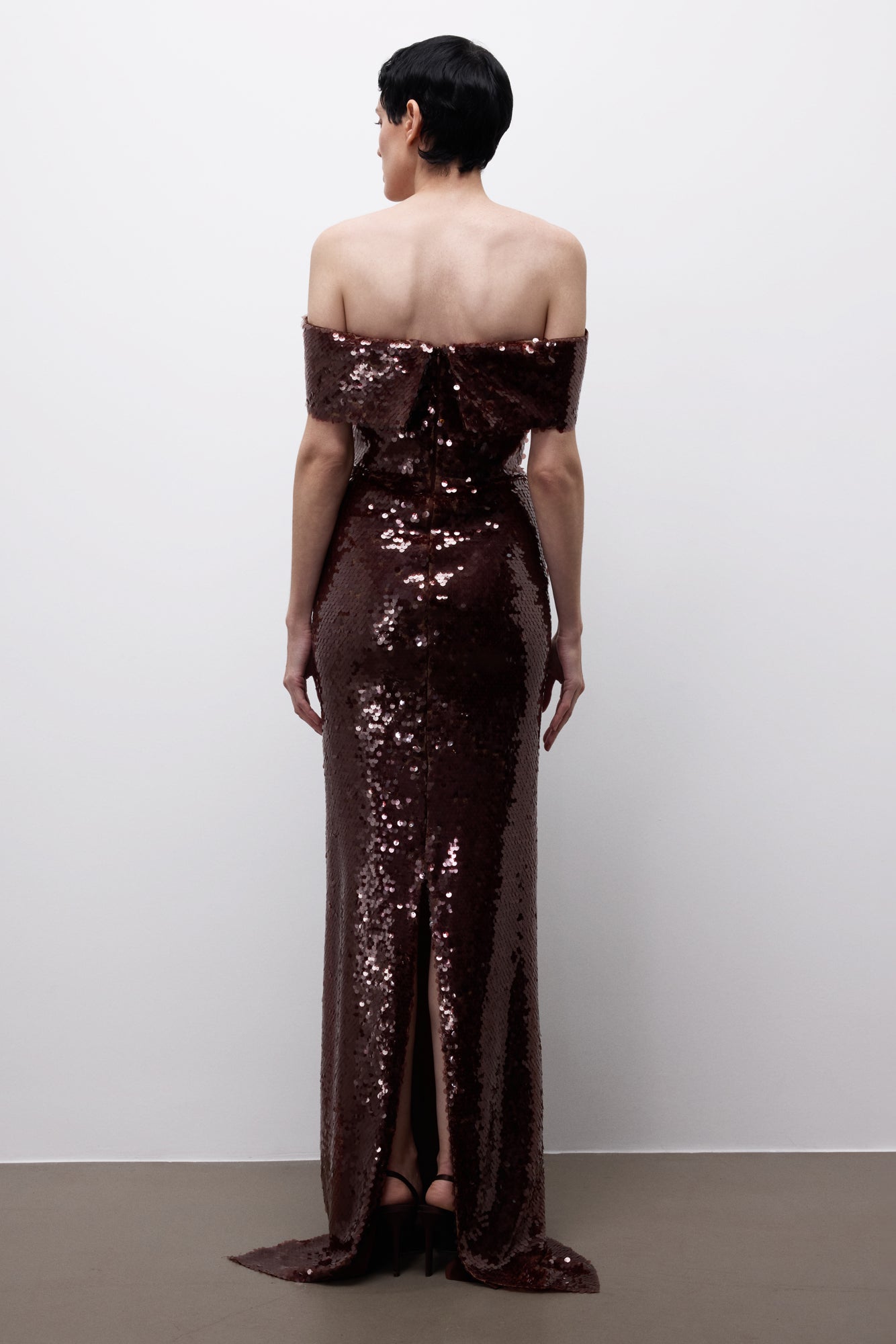A simple yet striking shimmer with an off-shoulder form and sequin texture.