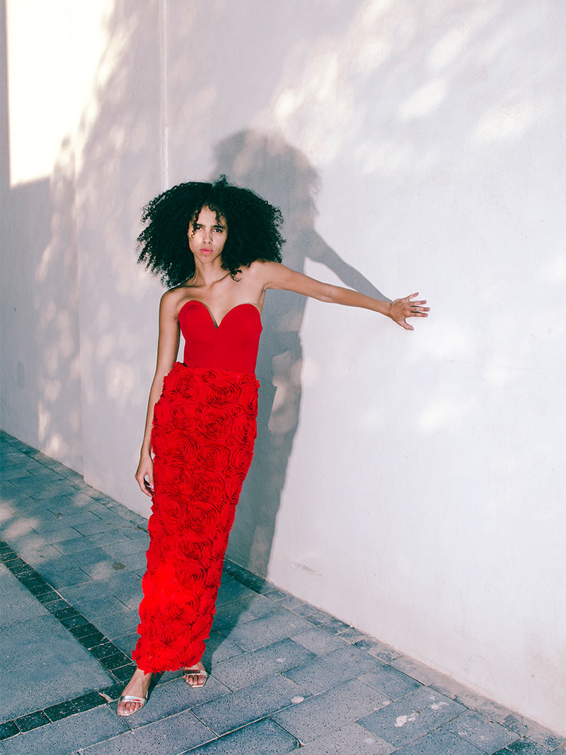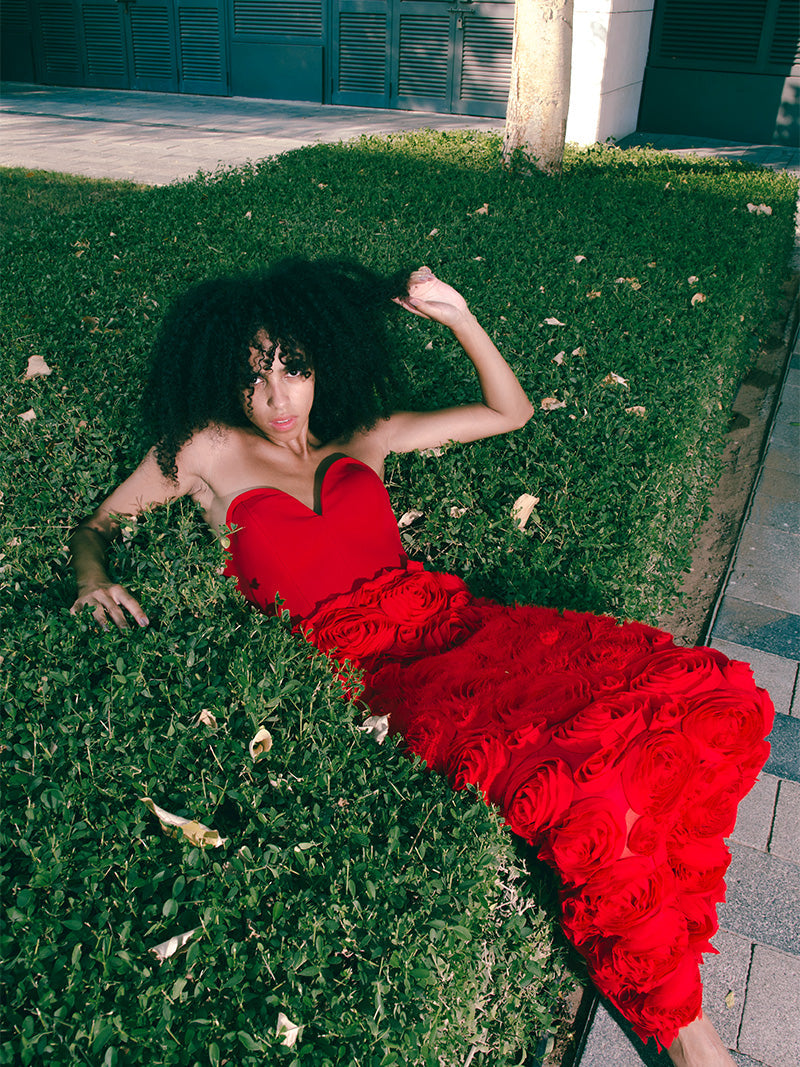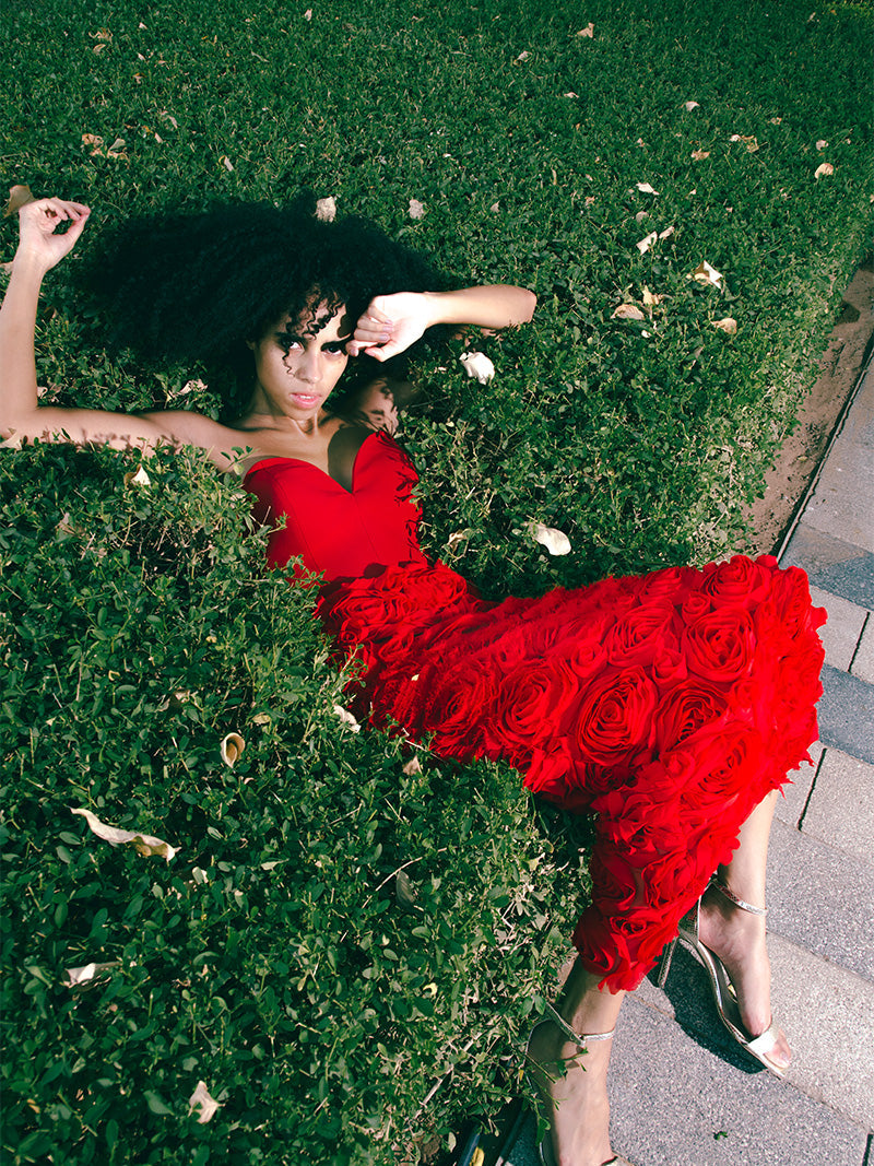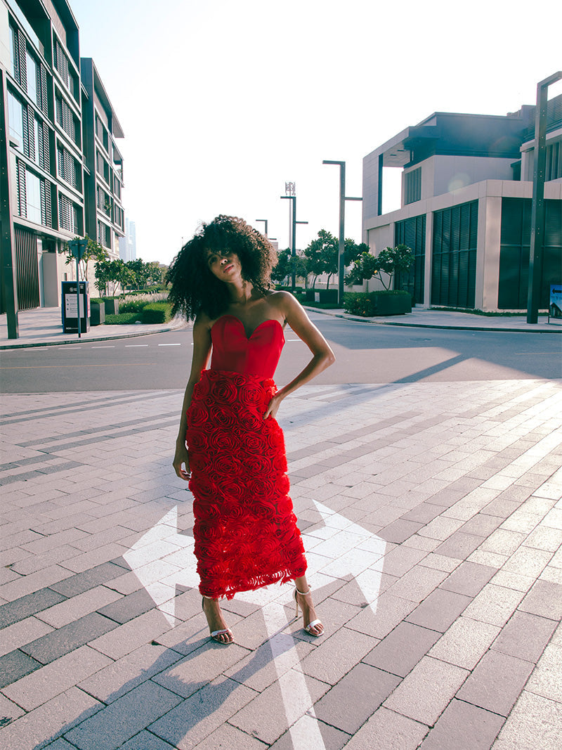 Dance with the desert winds and chase passion and romance. Open your soul for fierce adventures wearing the Rogue Dress adorned with untamed red roses and an amorous heart shaped top.