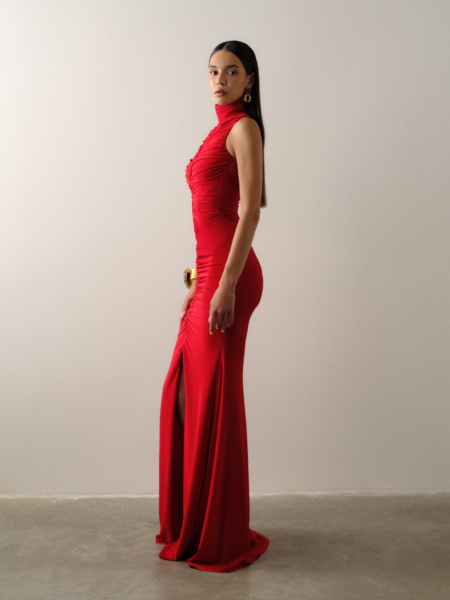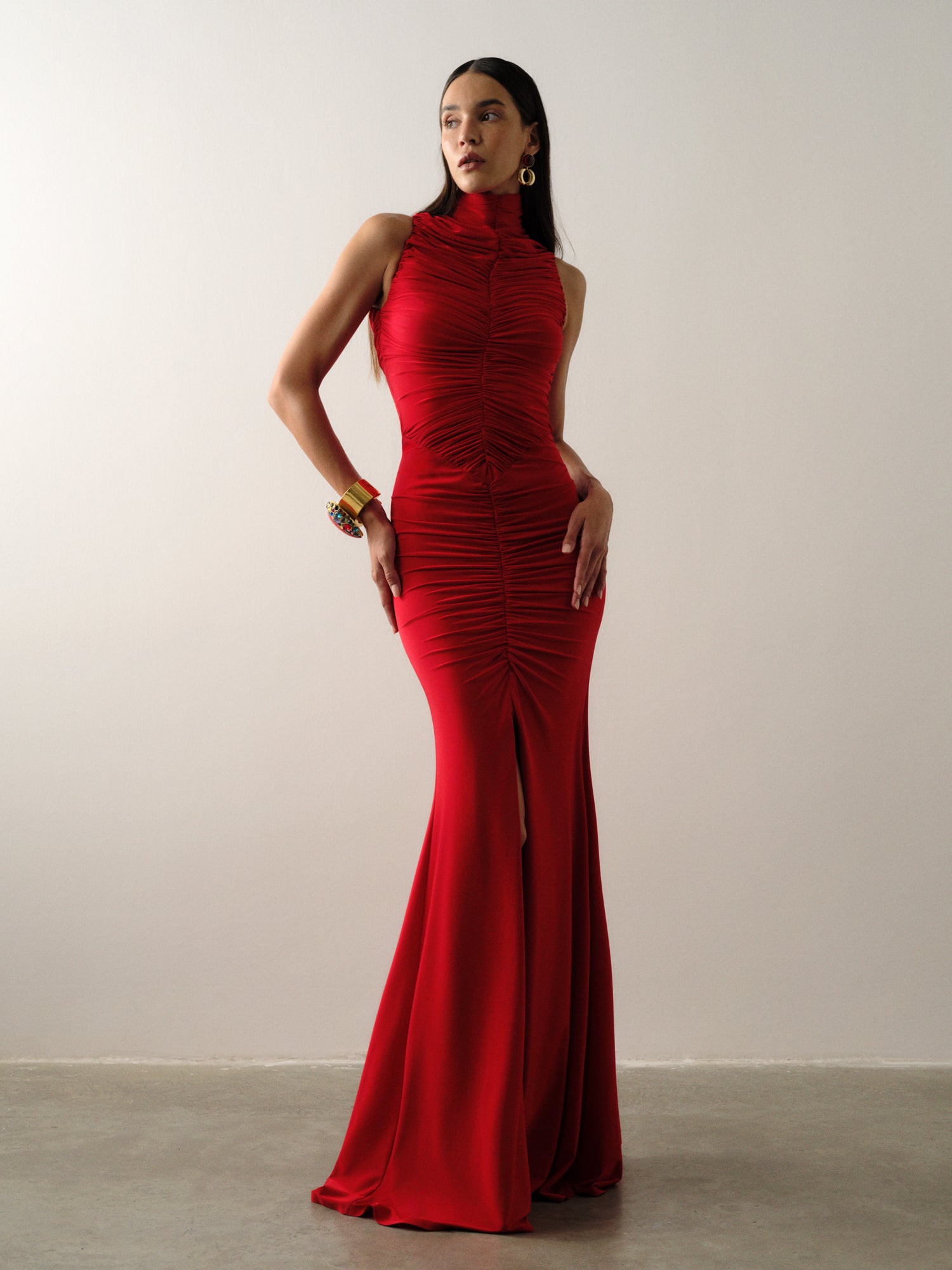 A fierce crimson silhouette with a high neck and ruched slit