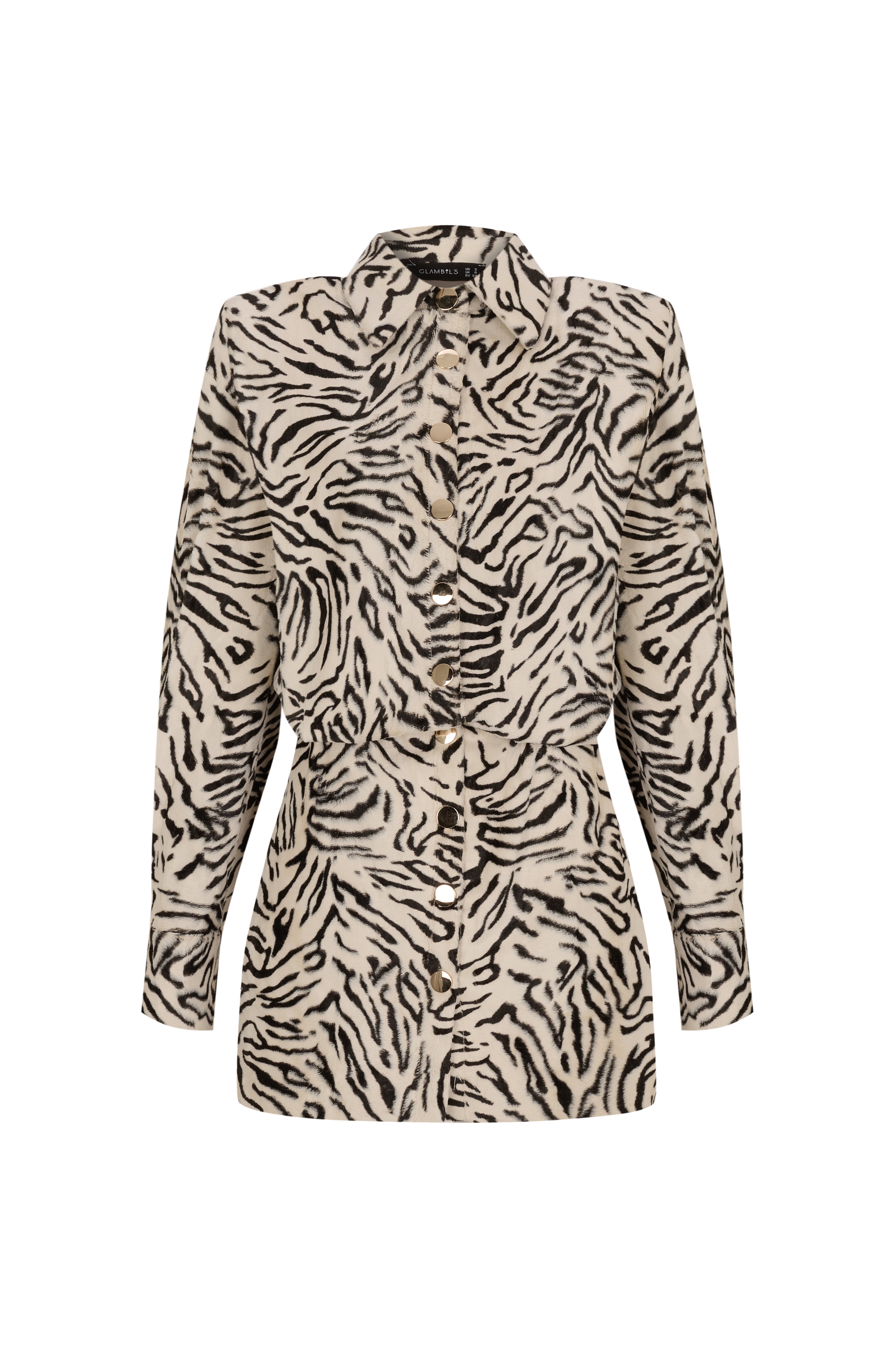 The Sahara Stripe Shirt Dress brings a modern safari elegance with its zebra print design. The waist-defining silhouette and gold-tone buttons create a strong and feminine look.