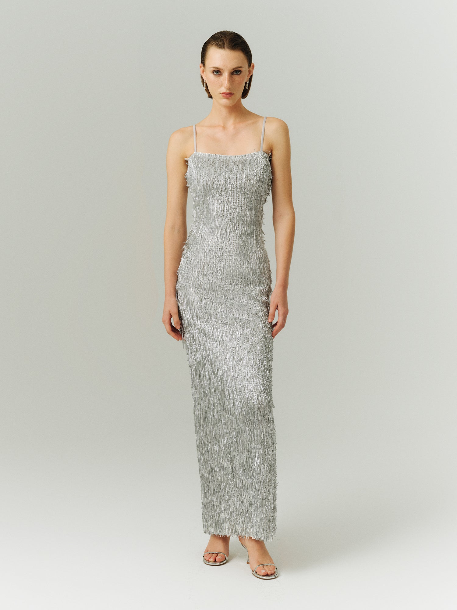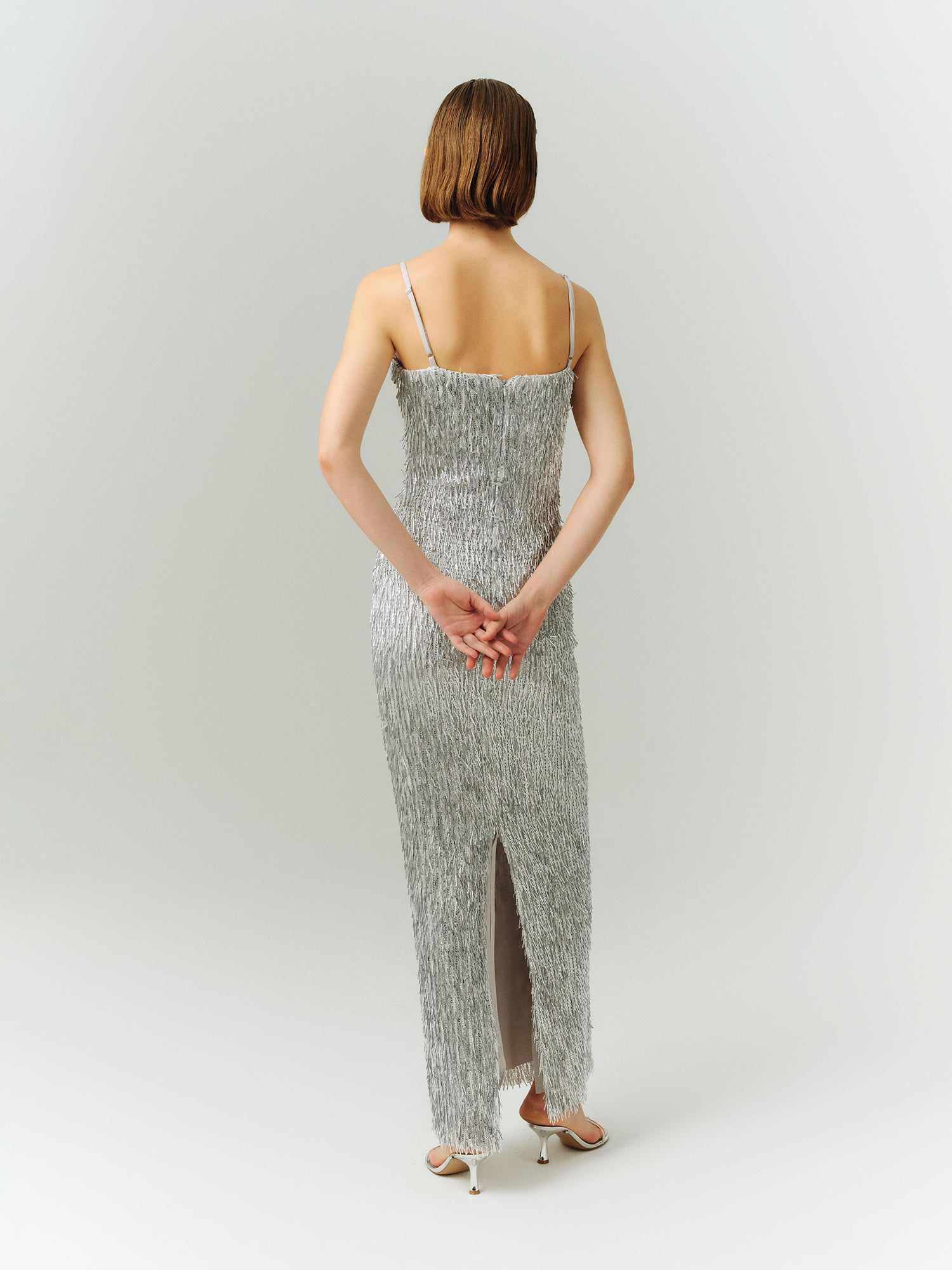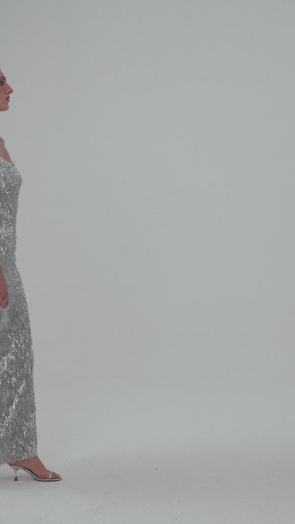 Write your own story of elegance in this fully lined sequin dress, where delicate straps and a chic back slit evoke timeless sophistication.
