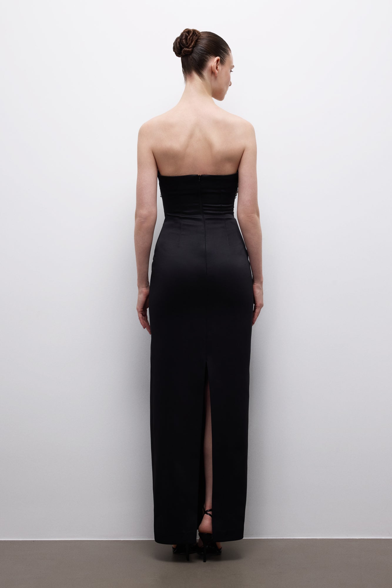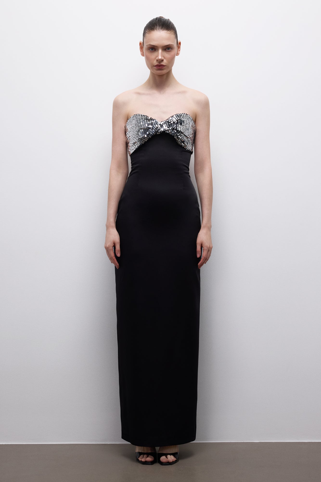 A strong silhouette where a minimal black form is balanced by a sequin-detailed bodice.