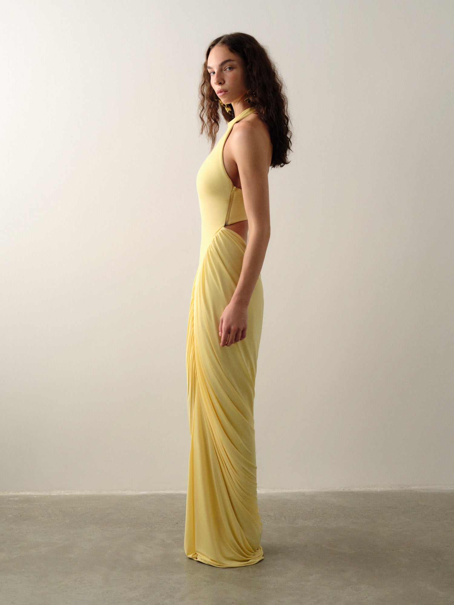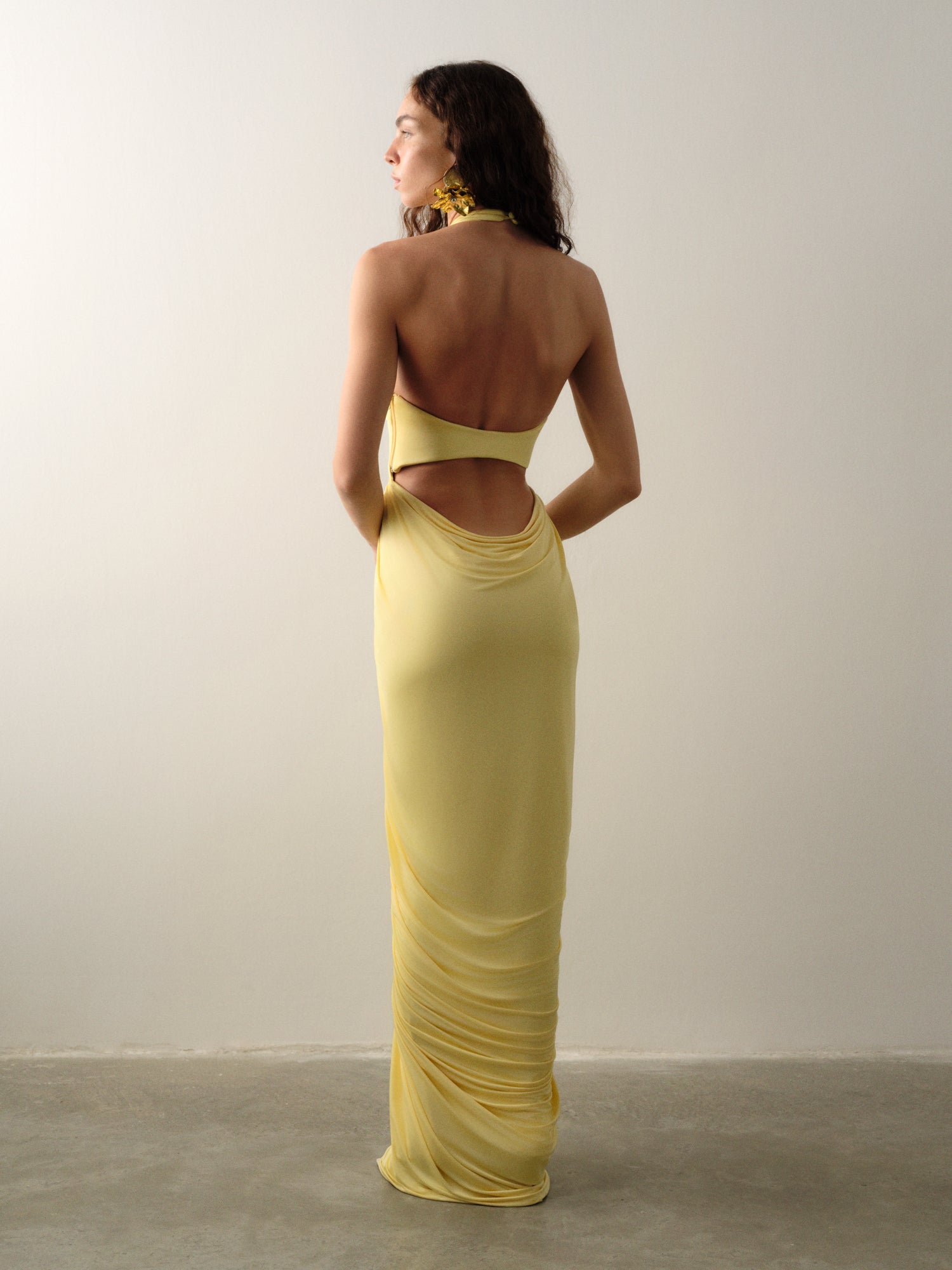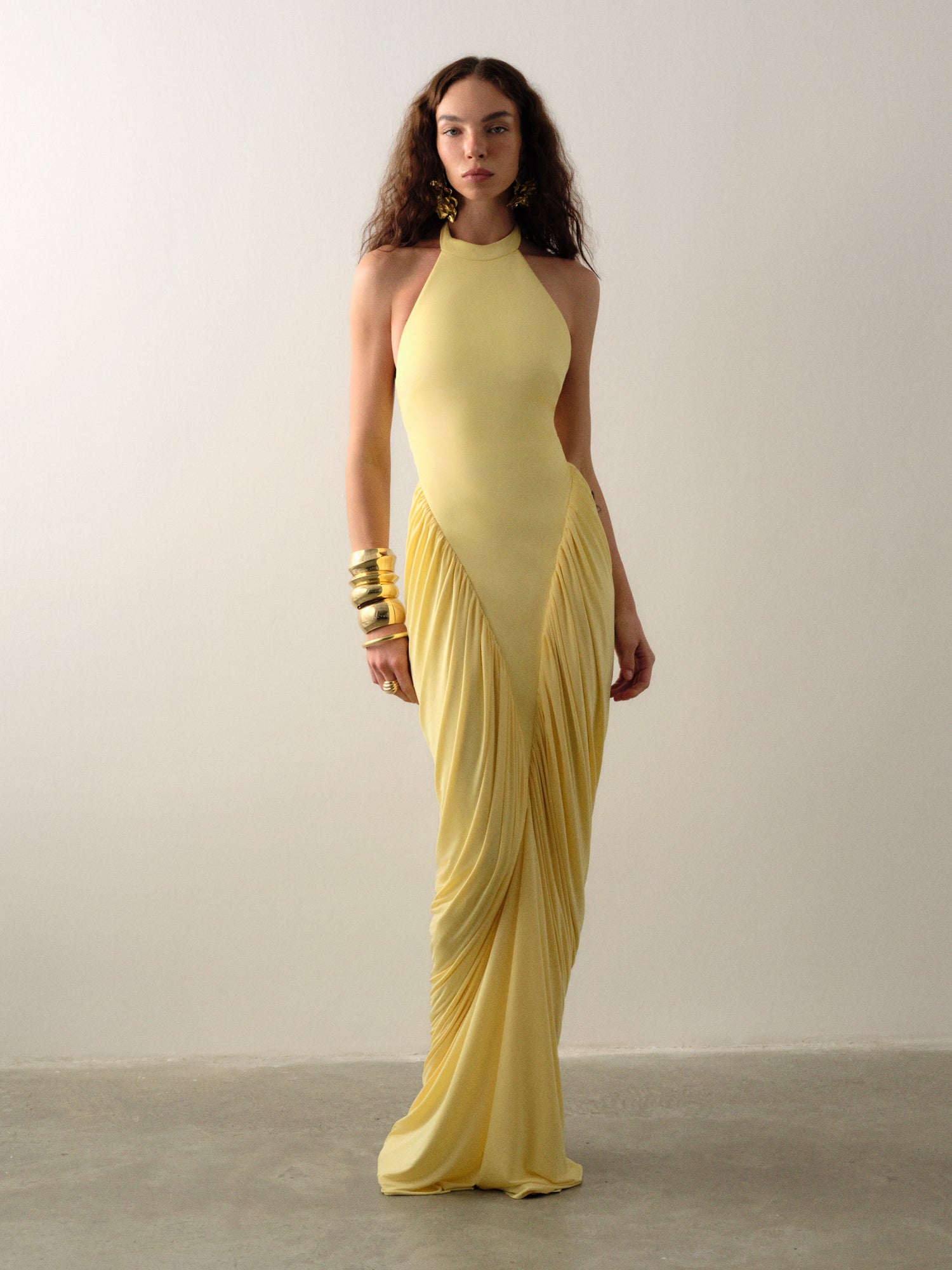 Golden halter neckline and soft V-drape