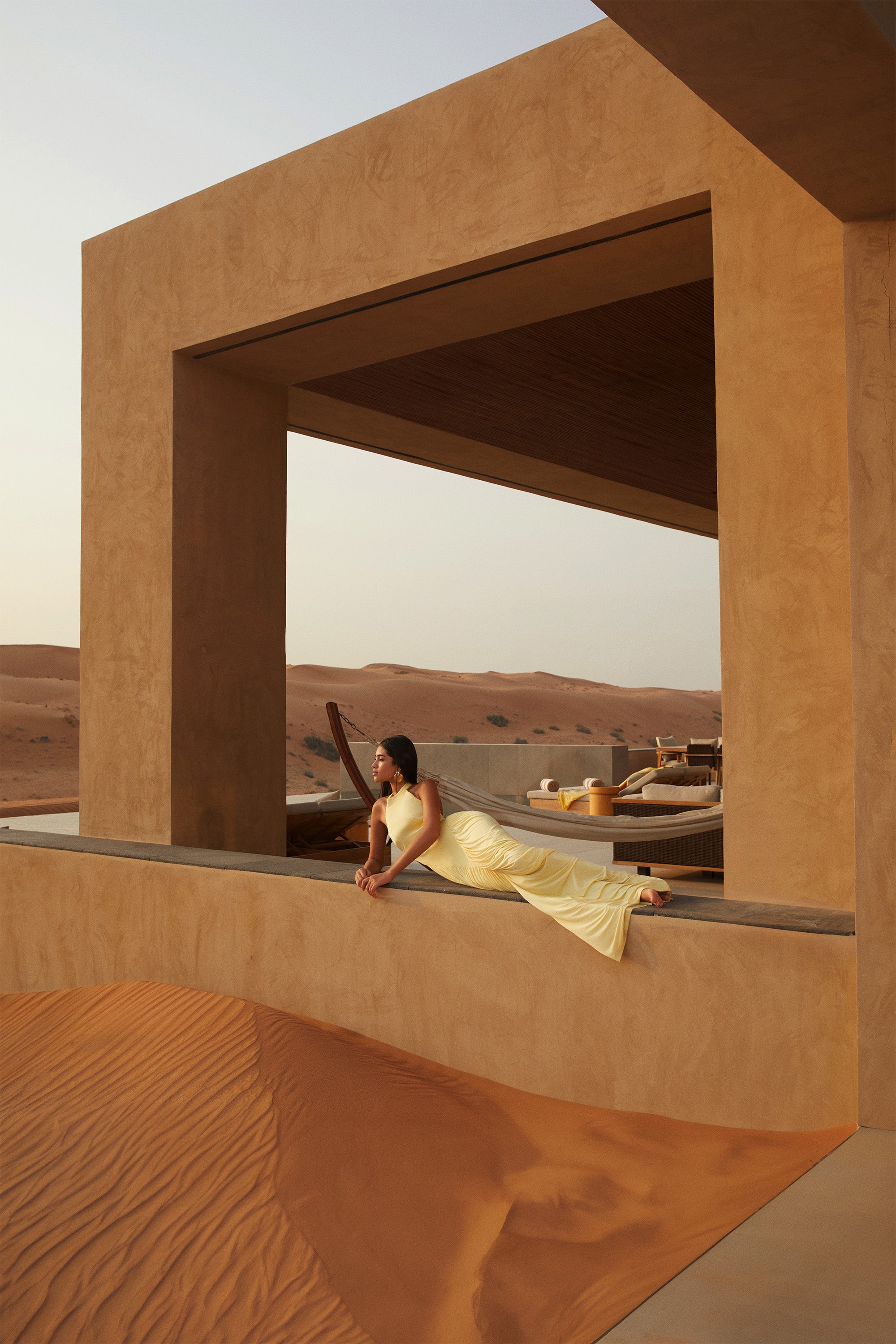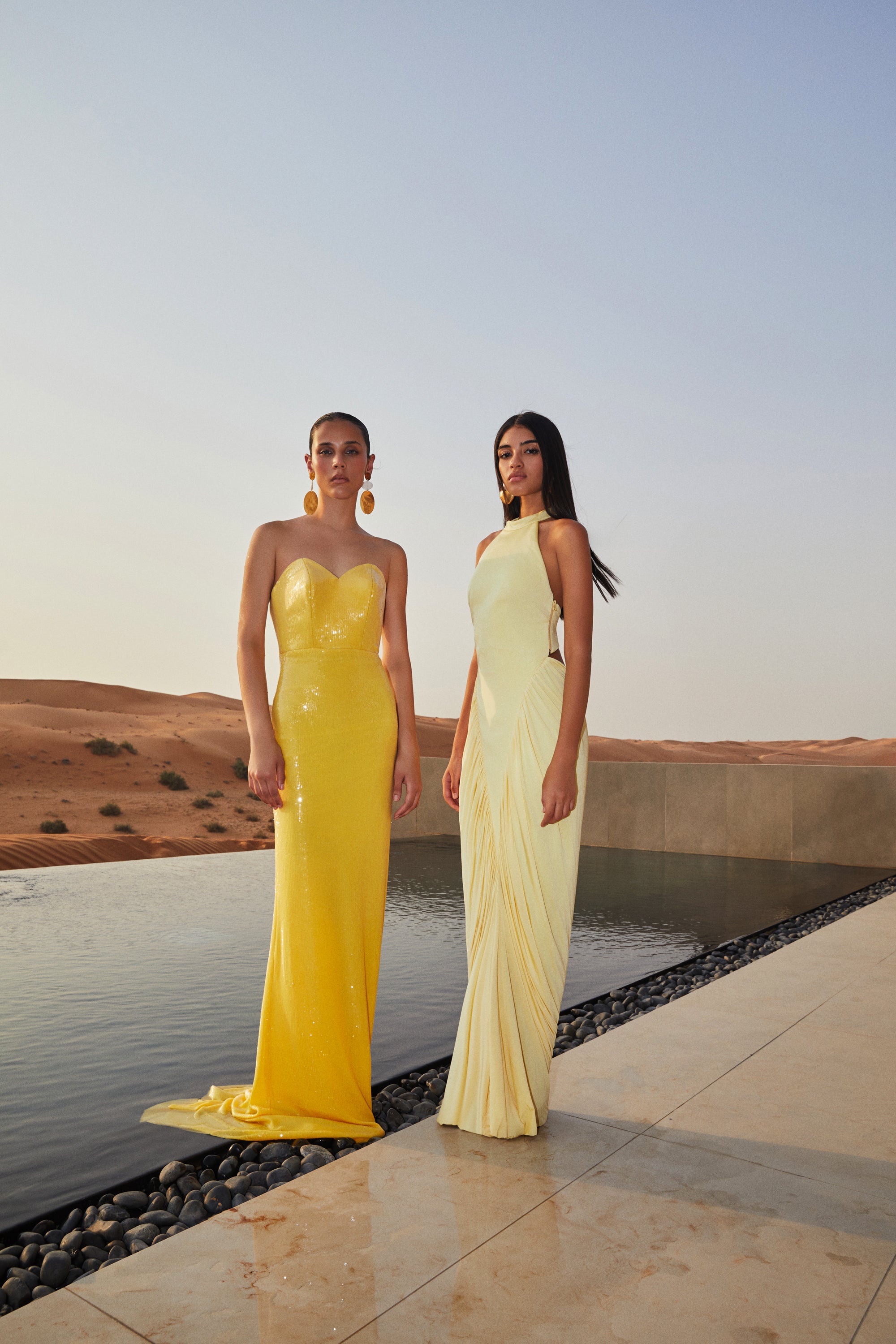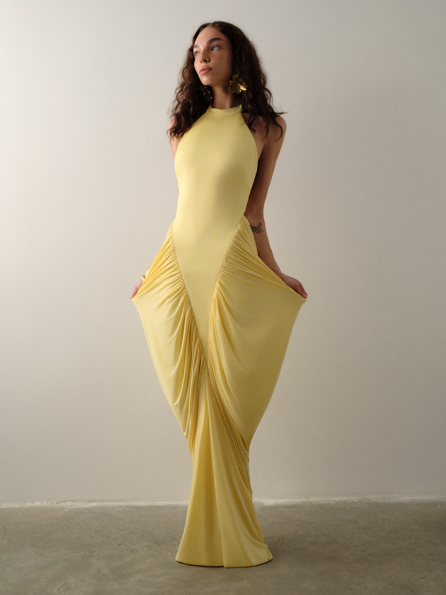 Golden halter neckline and soft V-drape