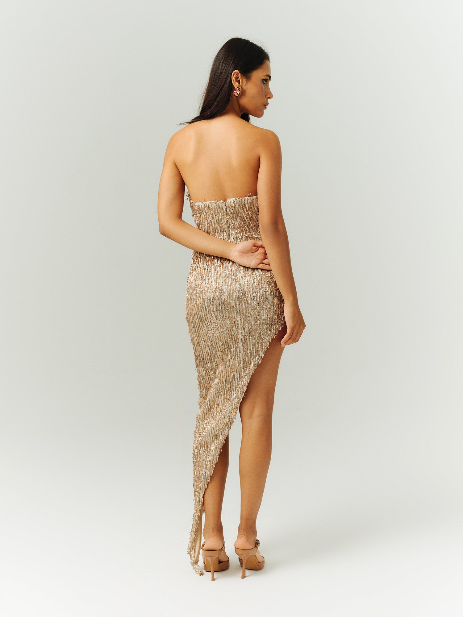 Boldly asymmetrical and richly adorned with sequins, this dress is designed to make a statement.