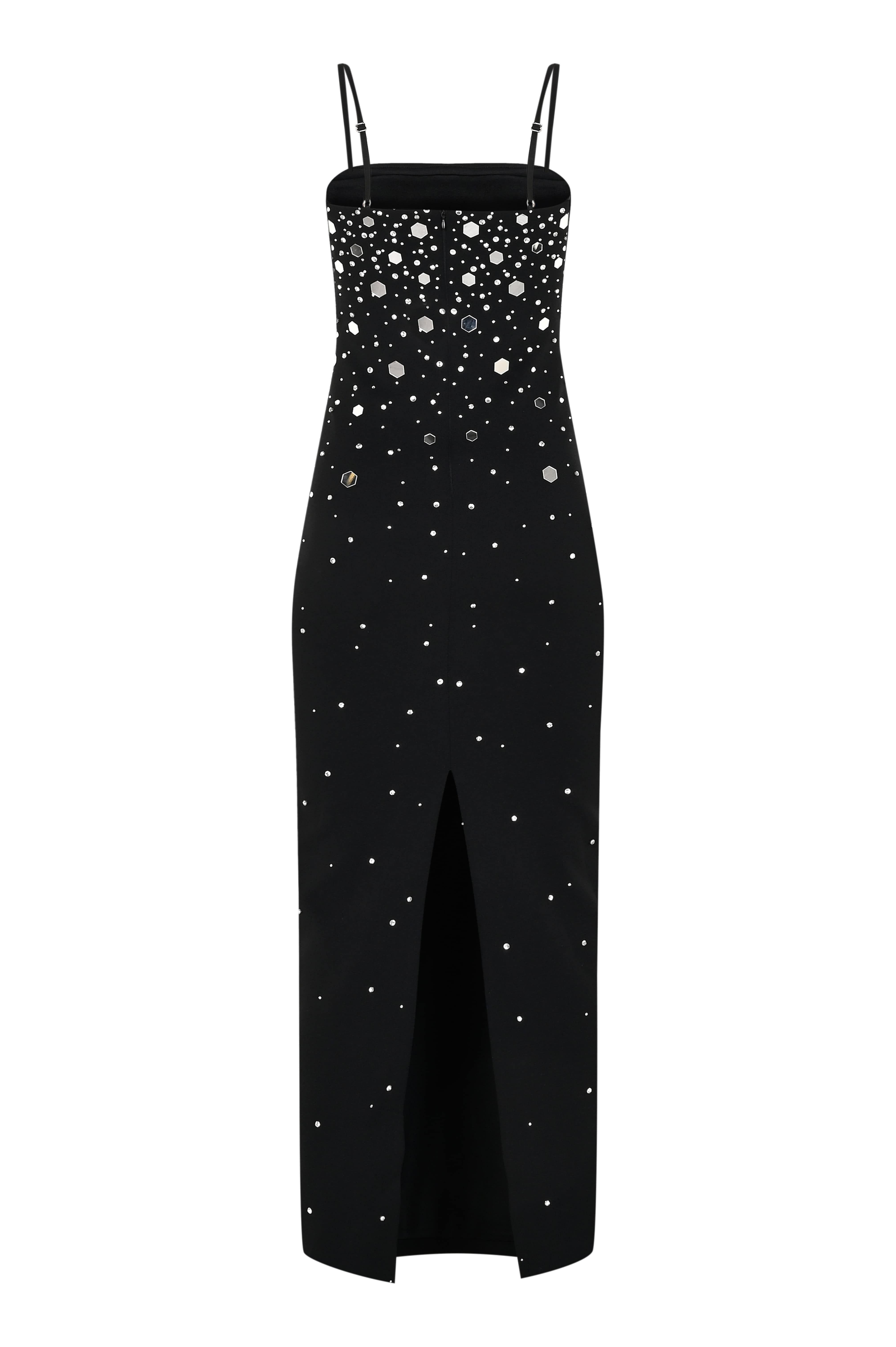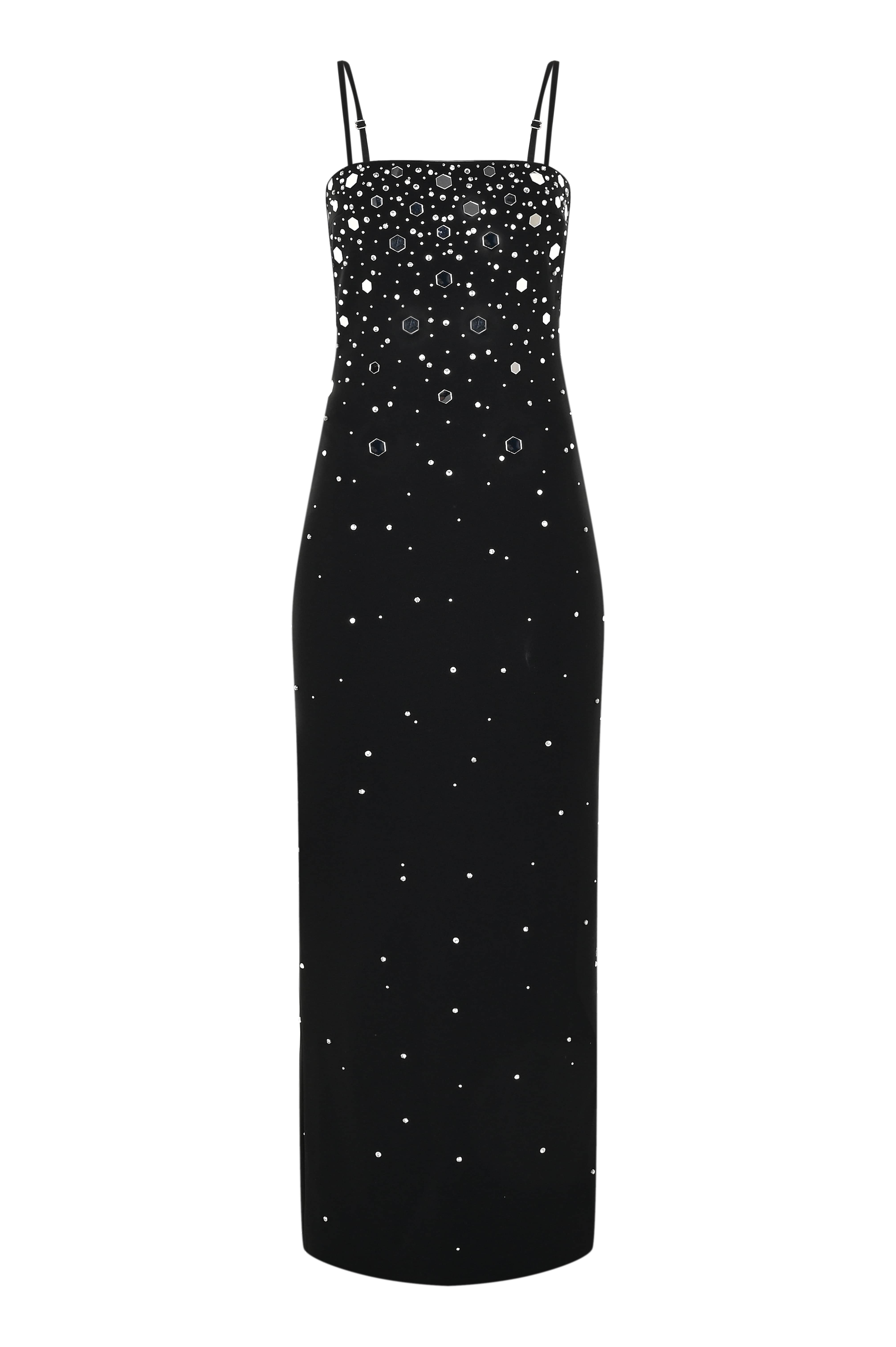 Stella brings the sparkle of the night sky to your wardrobe. This black strapless dress, adorned with crystal embellishments, shines like a constellation of stars. Its fitted silhouette creates a graceful shape, while the glittering details ensure all eyes are on you.